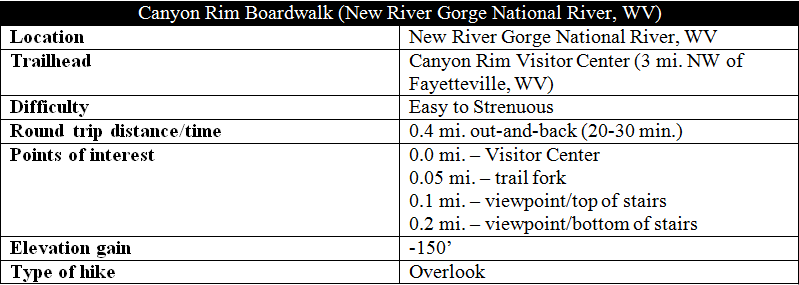 Many visits to New River Gorge National River in south central West Virginia begin at the Canyon Rim Visitor Center, situated off Route 19 on the east flank of the gorge. While some of the best hikes in the park lie elsewhere, the short Canyon Rim Boardwalk Trail offers excellent and convenient views of the gorge from the Visitor Center—that is, if you can manage the 178 wooden steps to and from the final overlook. There is perhaps no better place to view the New River Gorge Bridge, the world’s third-longest single-span arch bridge, which towers a jaw-dropping 876 feet above the New River.