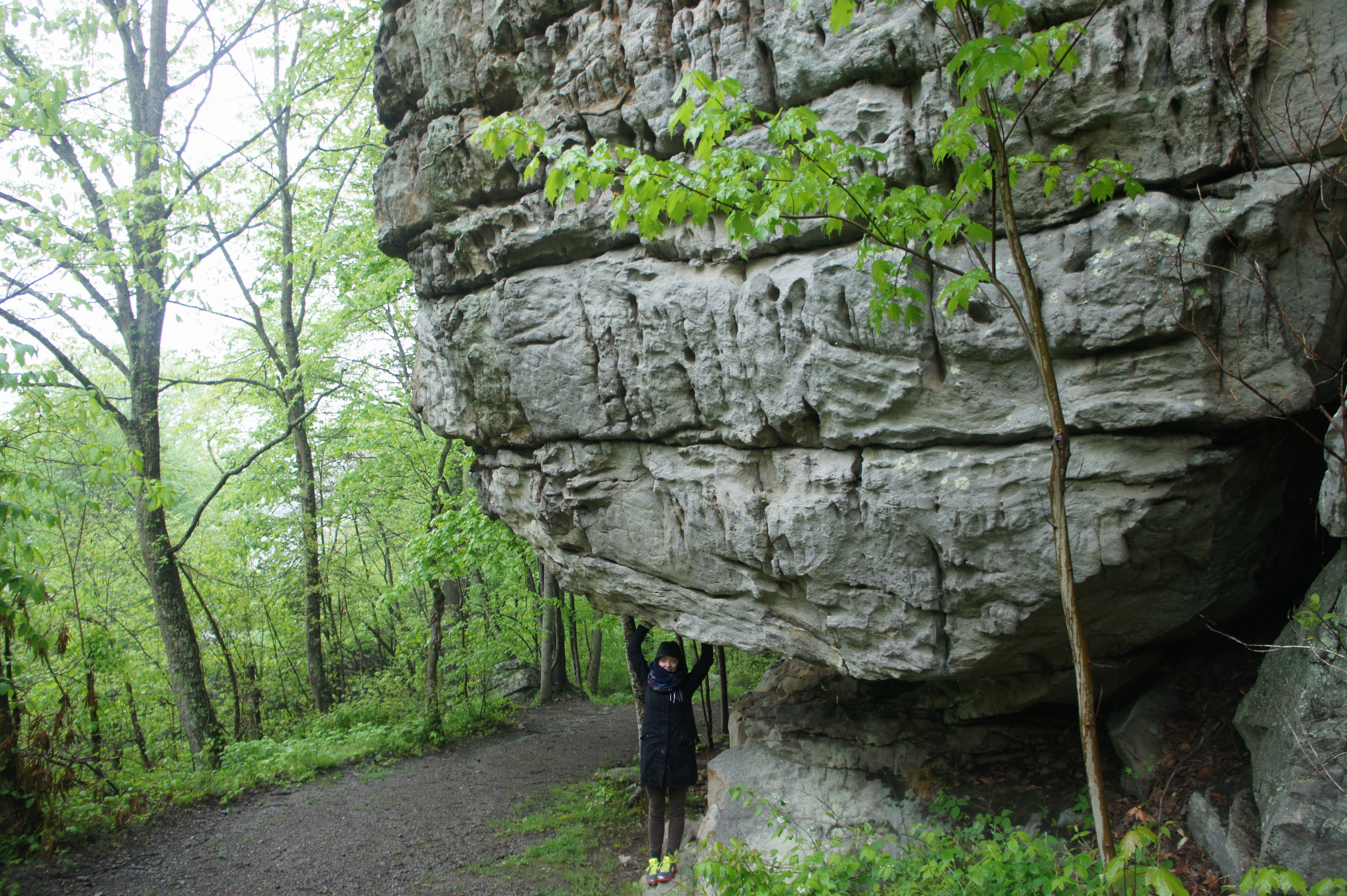 Continuing downhill from the caves, the Headhouse Trail gradually bears westward, passing a number of memorable rock formations of colossal size, including a rounded and striated chunk of limestone that juts out over the trail, a ship-sized boulder that reaches a sharp point some 20 feet above the path, and a two-tiered, mushroom-shaped monolith perched above a vertical drop on the left.