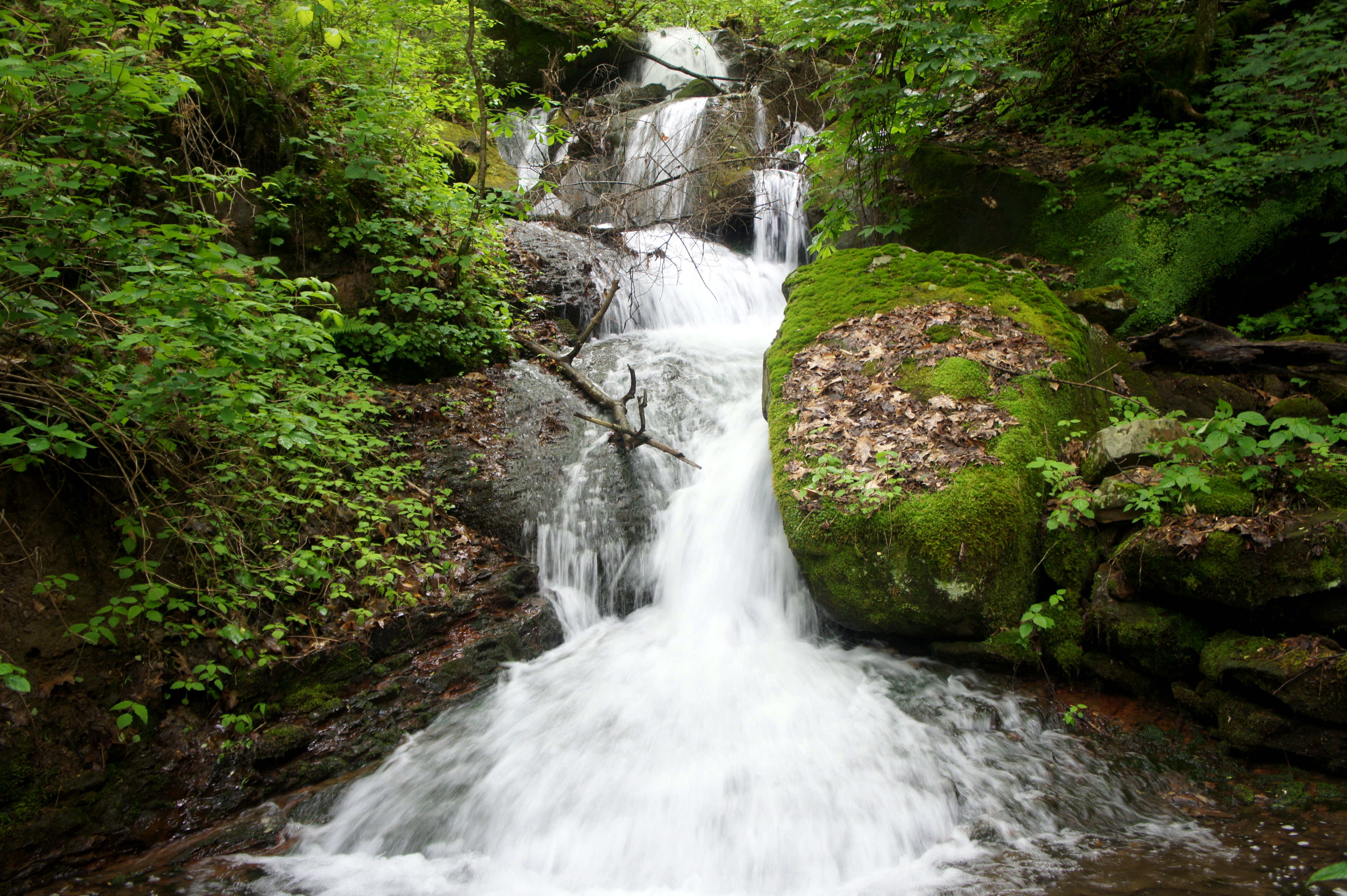 After traversing the bridge, it’s back uphill again as the trail cuts west along Glade Creek’s southern slopes. The climb is gradual, ascending a mere 50-75 feet in around 6/10 mile, but it’s enough to put the creek behind and mostly out of view. At 6.3 mile, the Narrow Gauge Trail ends abruptly at Old Sewell Road. Before heading left, follow the sound of rushing water across the road, where Sugarcamp Run somersaults over a set of seemingly endless cascades. This tucked-away cascade is surrounded by beautiful greenery, and the oozing waters remind one, albeit on a much smaller scale, of the stupendous waterfalls of the lush Columbia River Gorge in northern Oregon.