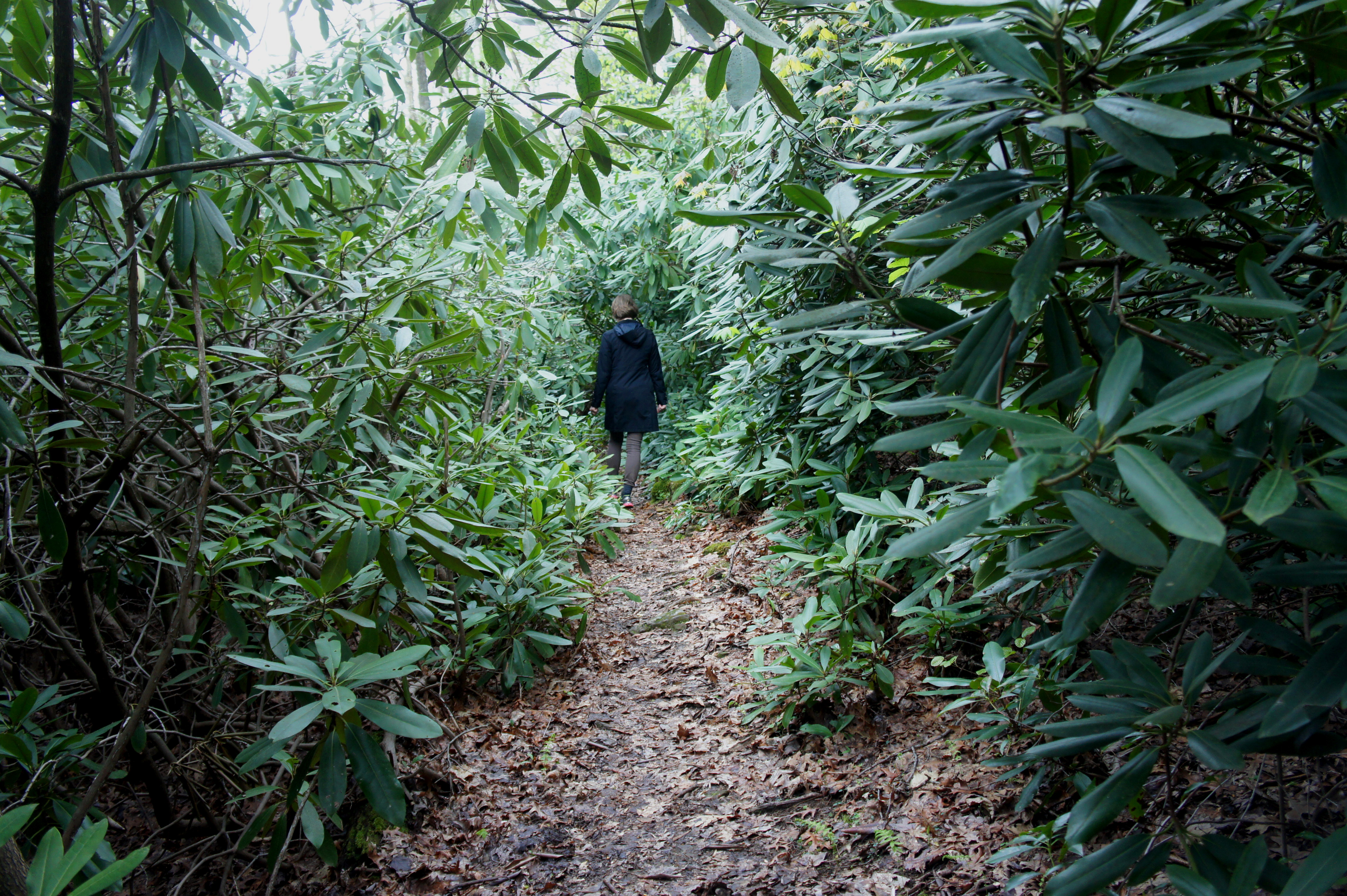 The hike immediately climbs into a grove of rhododendrons, following orange blazes through the leafy ravine. The 1/3-mile ascent to Boley Lake gains roughly 100 feet in elevation, making this the toughest—and rockiest—section of the walk. After a few minutes, the trail crosses a small bridge over Camp No. 15 Branch, carrying rushing waters obscured by dense thicket. After about 10-15 minutes, the trail suddenly leaves the woods behind, climbing a grassy hillside to the banks of Boley Lake.