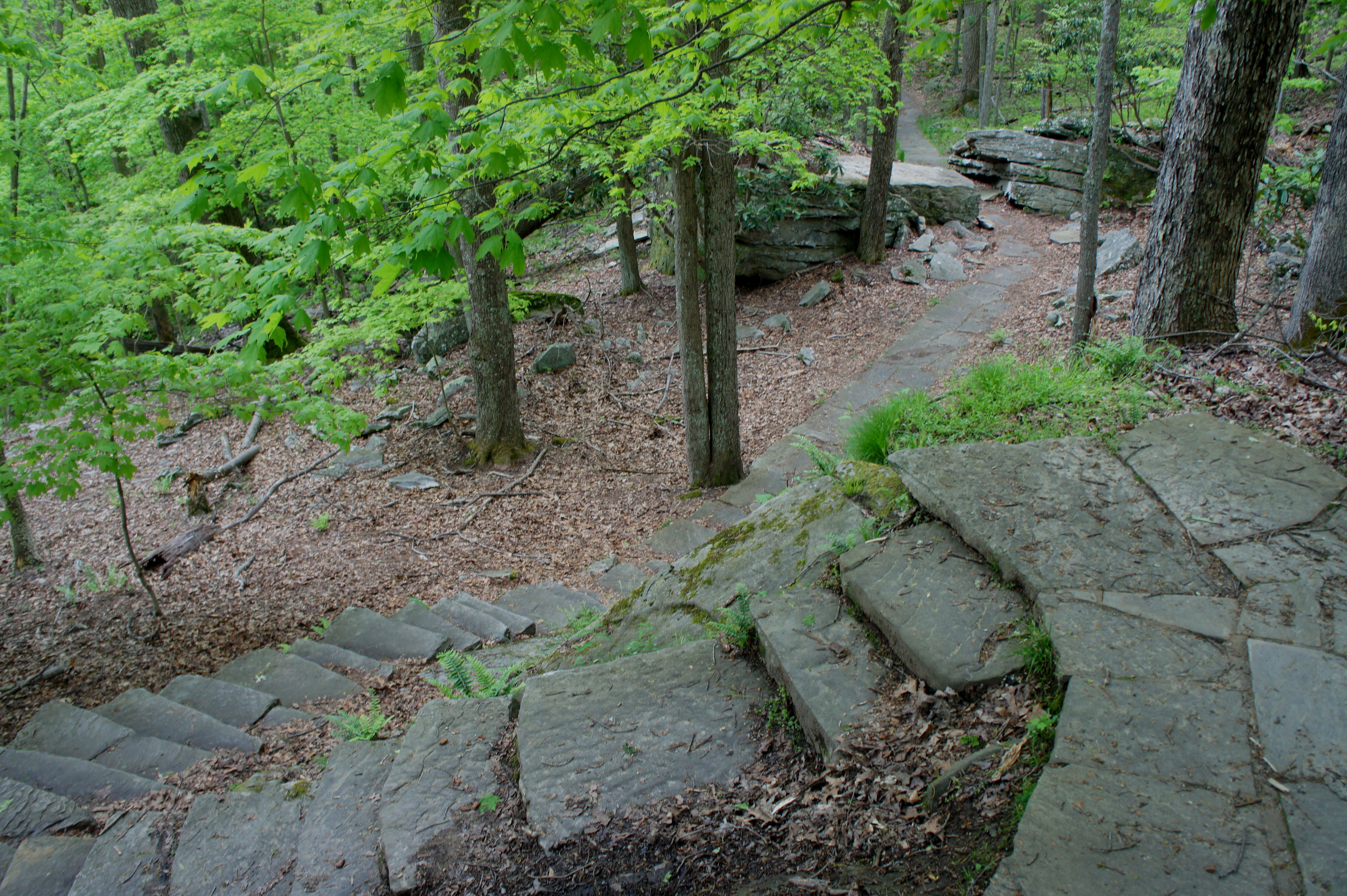 Nonetheless, hikers looking for a cool, shady walk can reach the Tunnel Trail by heading east from the Visitor Center, crossing the road, and following the wheelchair-accessible path to the Main Overlook. Just before the viewpoint, take a right onto the Tunnel Trail, which is well-marked. Almost immediately, the neatly-laid stone path drops down a double staircase, then squeezes through a rock cut.