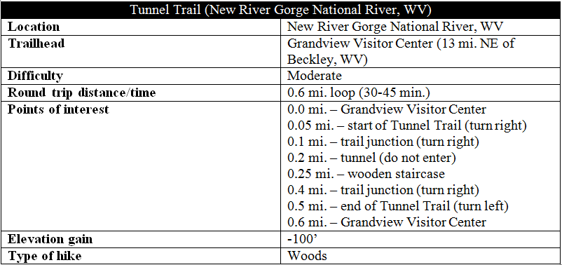 Begin the hike from the parking area at the Grandview Visitor Center, the primary information station in the Grandview section of New River Gorge National River. Situated just 20 minutes from Beckley—a former coal mining town of 17,000—Grandview is a popular picnicking, climbing, and hiking spot for locals and tourists alike. The highlights of the area are the stunning viewpoints overlooking New River Gorge—namely Main Overlook and North Overlook (see my previous post here); lacking open vistas, the Tunnel Trail is more of an afterthought.