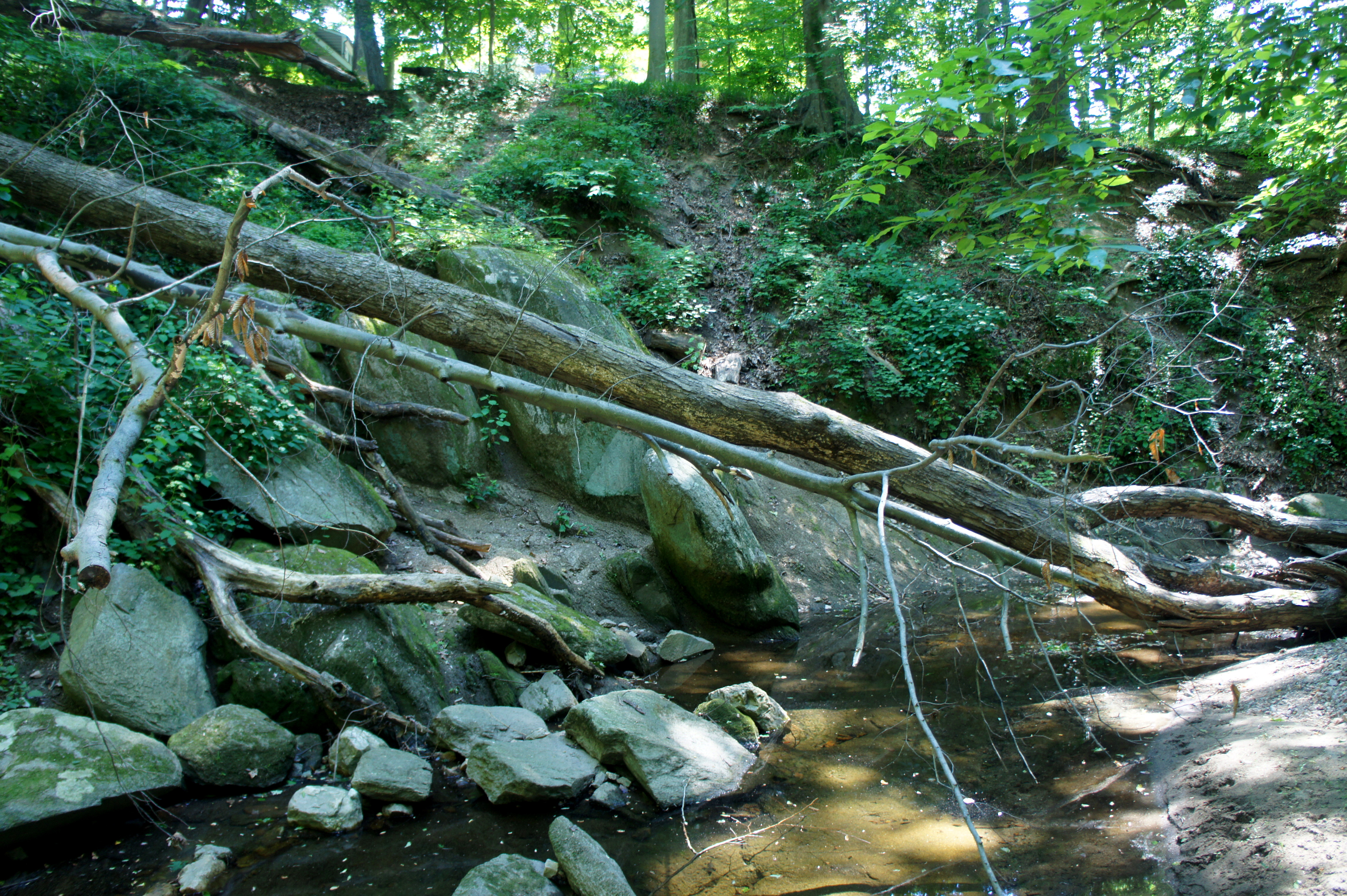 Time along the left bank is fleeting; stay right at the route junction (a connecting trail leads left to Beech St.), then cross Pinehurst Branch a second time, returning to the south shore. This crossing is one of the more interesting: the high bank on the right has become the deposit point for a smattering of large boulders, which, at the time of writing, were further enveloped by a large, fallen tree.