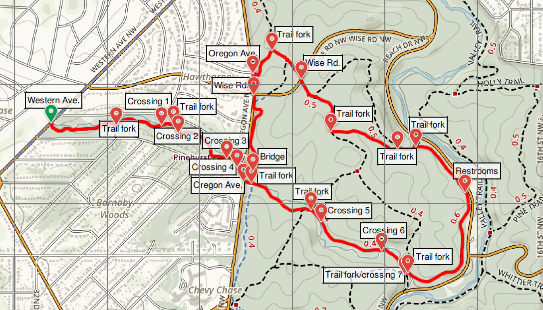 Map of Pinehurst Branch Trail Loop, Rock Creek Park; created using National Geographic Maps/AllTrails, alltrails.com (Check out the PDF version, interactive map, and Map My Hike track)
