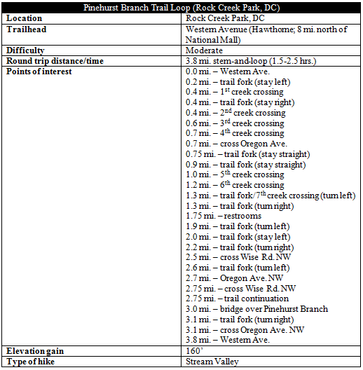 Pinehurst Branch Trail Rock Creek Park hike information Washington DC