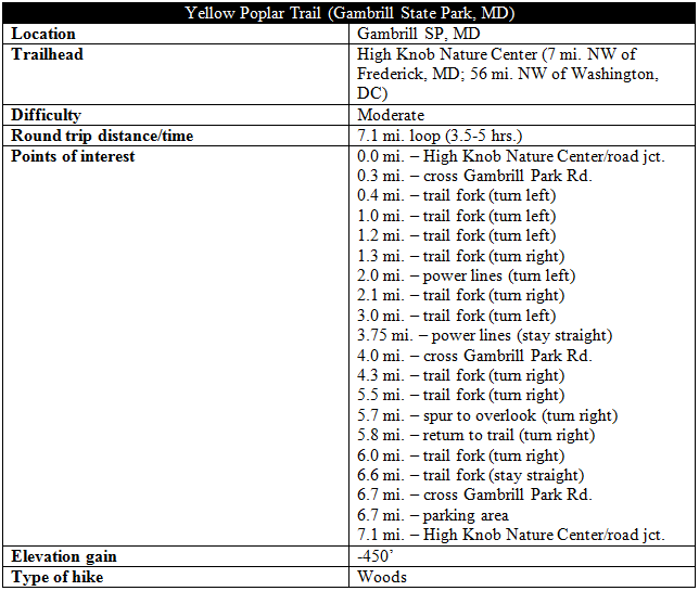 The Yellow Poplar Trail intersects with Gambrill Park Road at a number of places, but there is probably no place better to start than the parking area at the High Knob Nature Center, situated just off Gambrill Park Road about one mile from the entrance. (Note: A stone’s throw from Frederick, Maryland, Gambrill State Park is about an hour’s drive from both Baltimore and Washington, DC.) While the nature center is only open by appointment, the parking area across the street has around 10-12 spots. (Note: Additional parking is available farther south at South Frederick Overlook in the High Knob Area.)