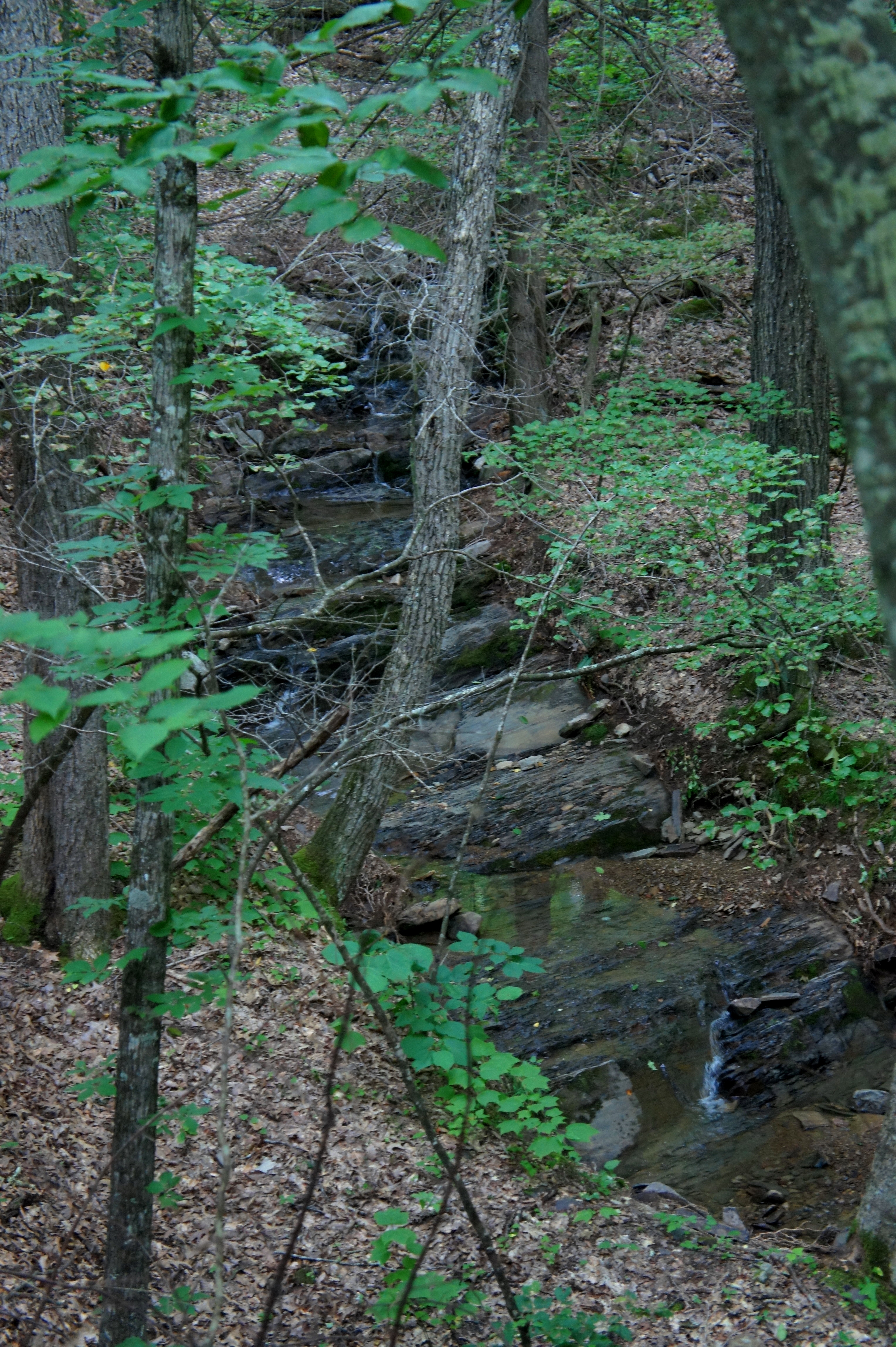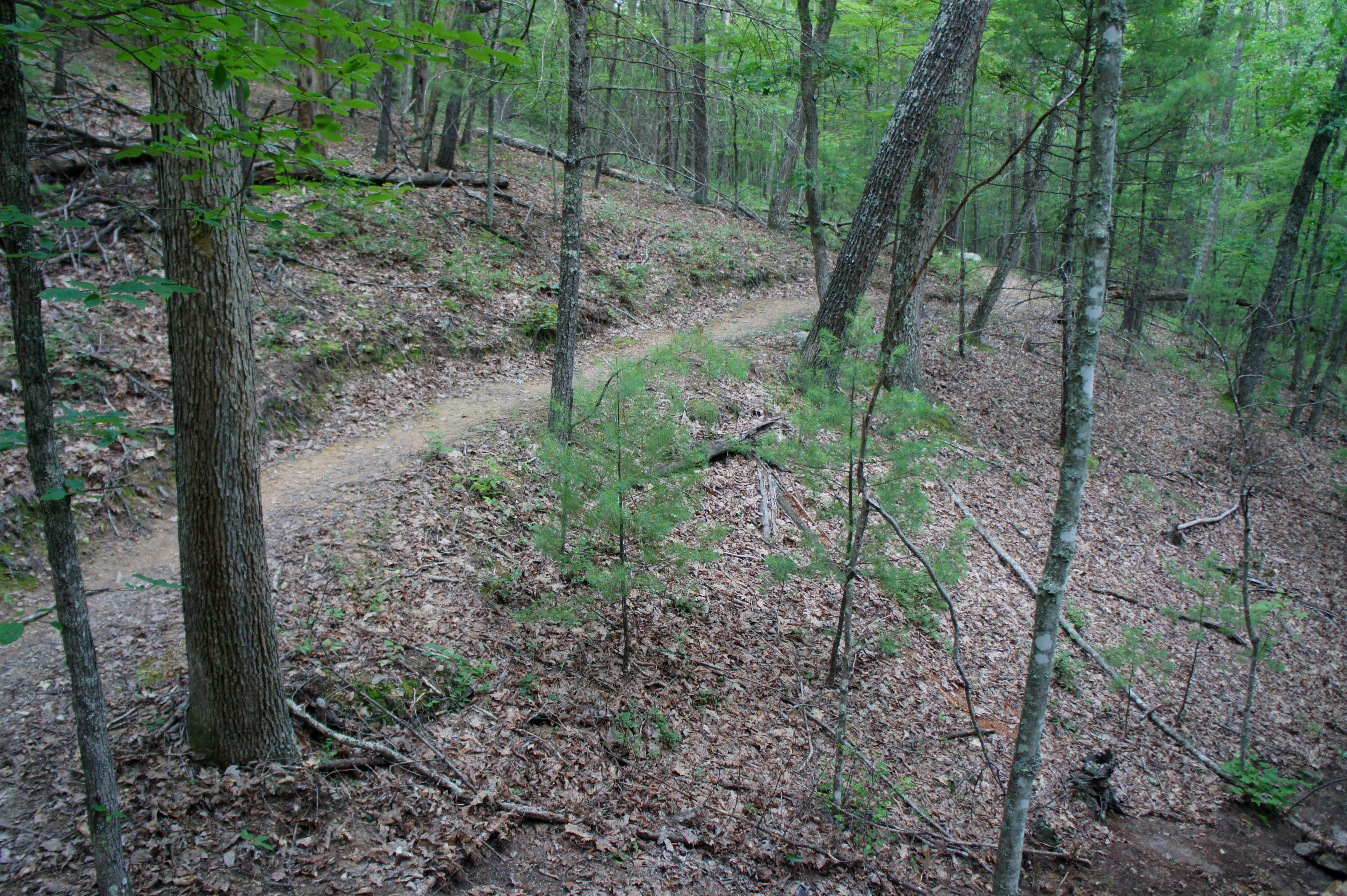 The bulk of the infrastructure in the park is situated in a valley between Kates Mountain and White Rock Mountain, but the Old Field Loop after 1/10 mile begins to gradually ascend partway up the western flank of Kates. The climb is a bit unusual, comprising six seemingly unnecessary switchbacks—slowly meandering up the mountain when blazing straight up the hillside would probably not be an insurmountable task. The advantage is that hikers can tirelessly enjoy the scenery: relatively young woods with a paucity of undergrowth. Towering oaks form the top of the canopy, while rhododendrons, chestnuts, and Virginia pines fill the space in between.