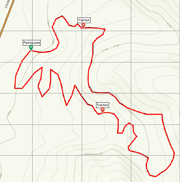 One mile from the start, the trail finally turns away from the ravine, leaving it behind as it bears northwest along the hillside. At 1.1 miles, the trail crosses another old road, now overgrown with green grasses. Minutes later, the trail crests a high point, then drops again to skirt a minor ravine, followed 1/10 mile later by a second. Now bearing north, the footpath gradually descends to another trail fork. Again the route bisects the Old Field Road; stay straight.