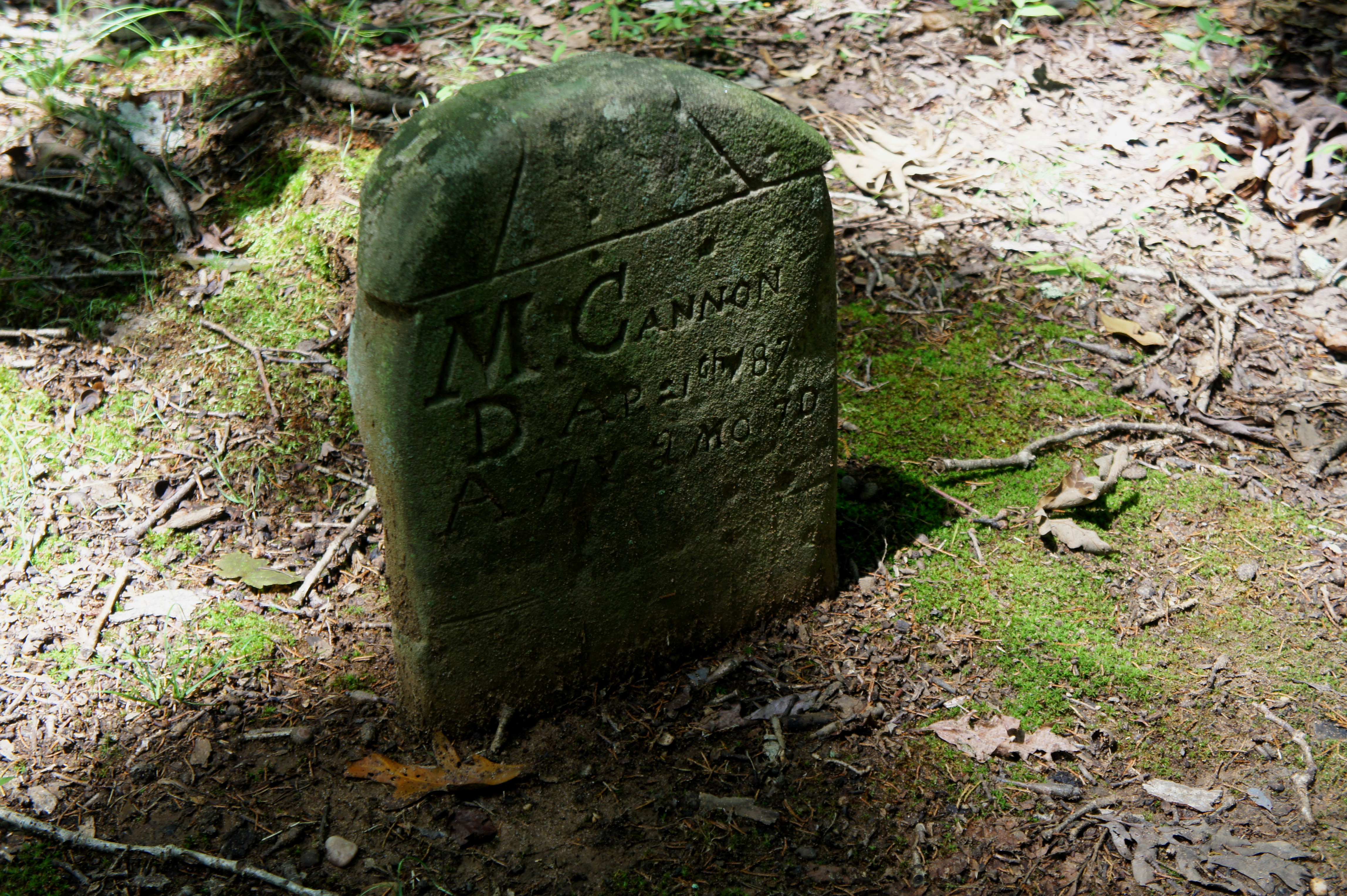 Take a short detour by heading right to see the Cannon Reid Cemetery (lovingly misspelled as “cemetary” on the sign), the resting place for a one Euriel Reed (1884-1918) and M. Cannon (1976-1873), among others. (Note: Presumably former residents of the area?) The first gravestone is situated about 200 feet down the narrow footpath on the right, while M. Cannon’s grave marks the end of the short spur trail along a woody ridge. Retrace your steps, return to the main trail, and continue right.