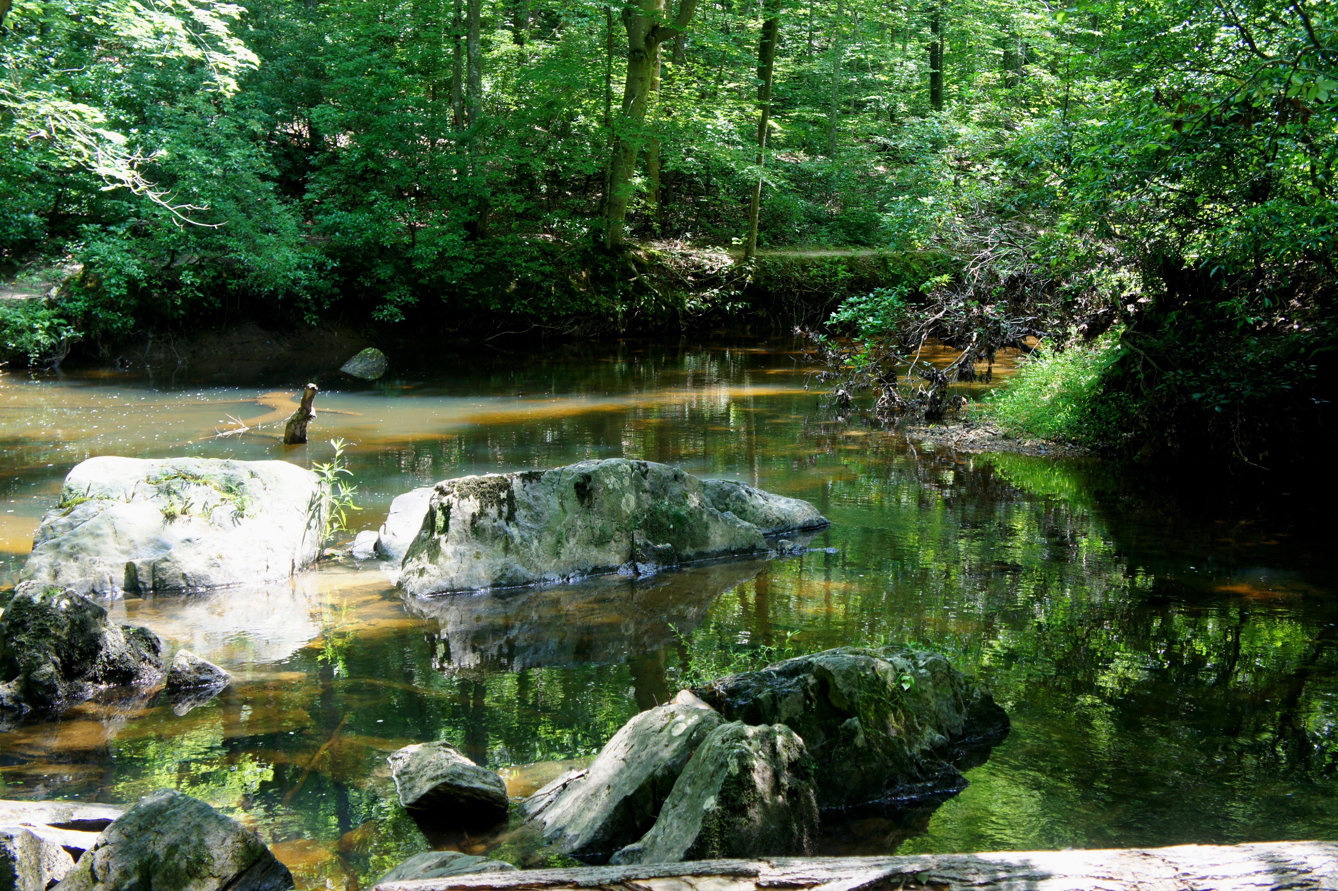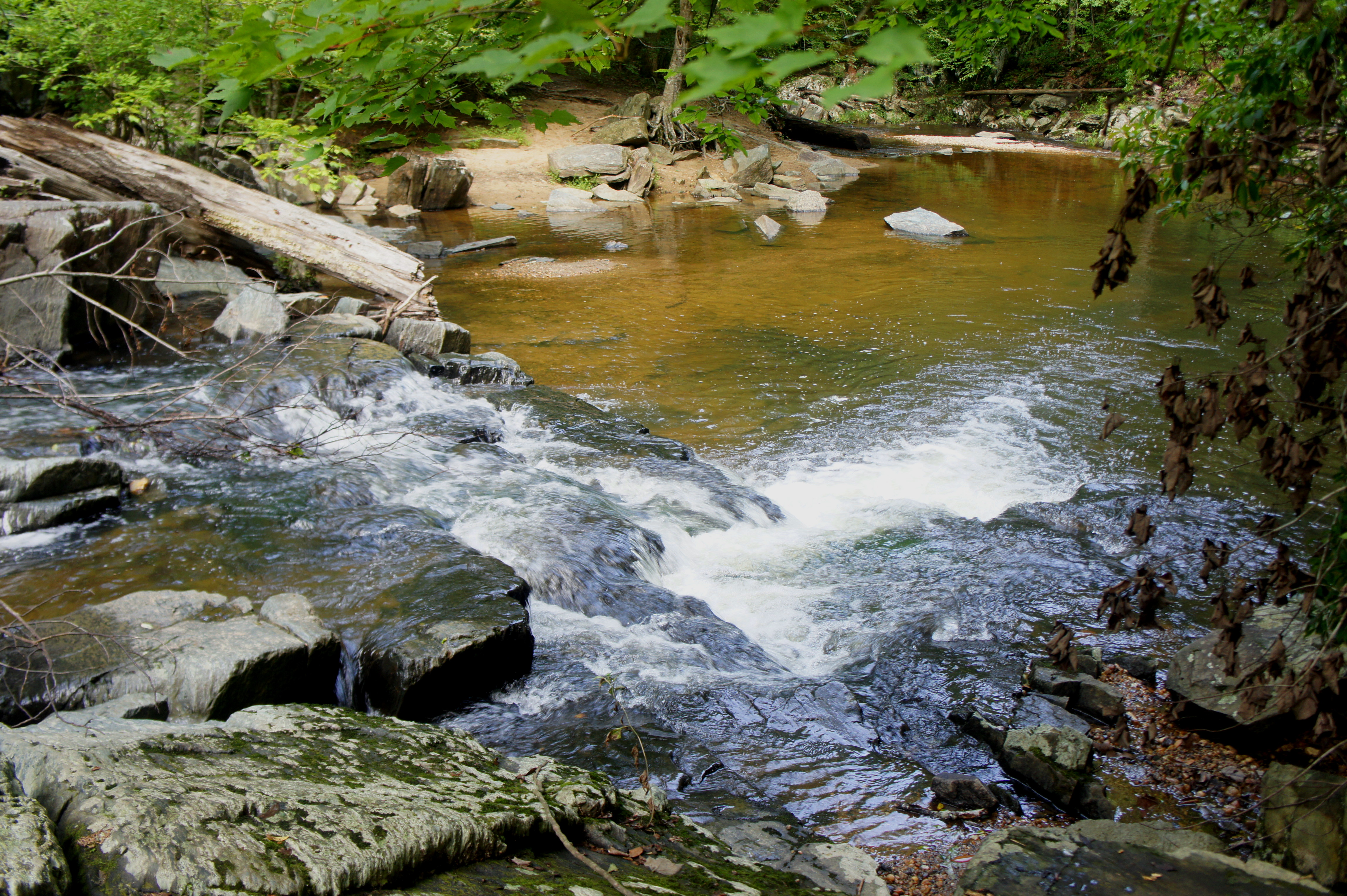 Around ½ mile further, the rate of descent steepens as the sound of running water finally comes within earshot. Nearing the confluence of the North Fork and South Fork of Quantico Creek, the trail bears left at around one mile and reaches the banks of the South Fork. From here the trail follows the creek upstream; there is a nice swimming hole at roughly 1.2 miles. Across the creek, it is easy to spot hikers along the longer and more popular South Valley Trail, which hugs the west bank.