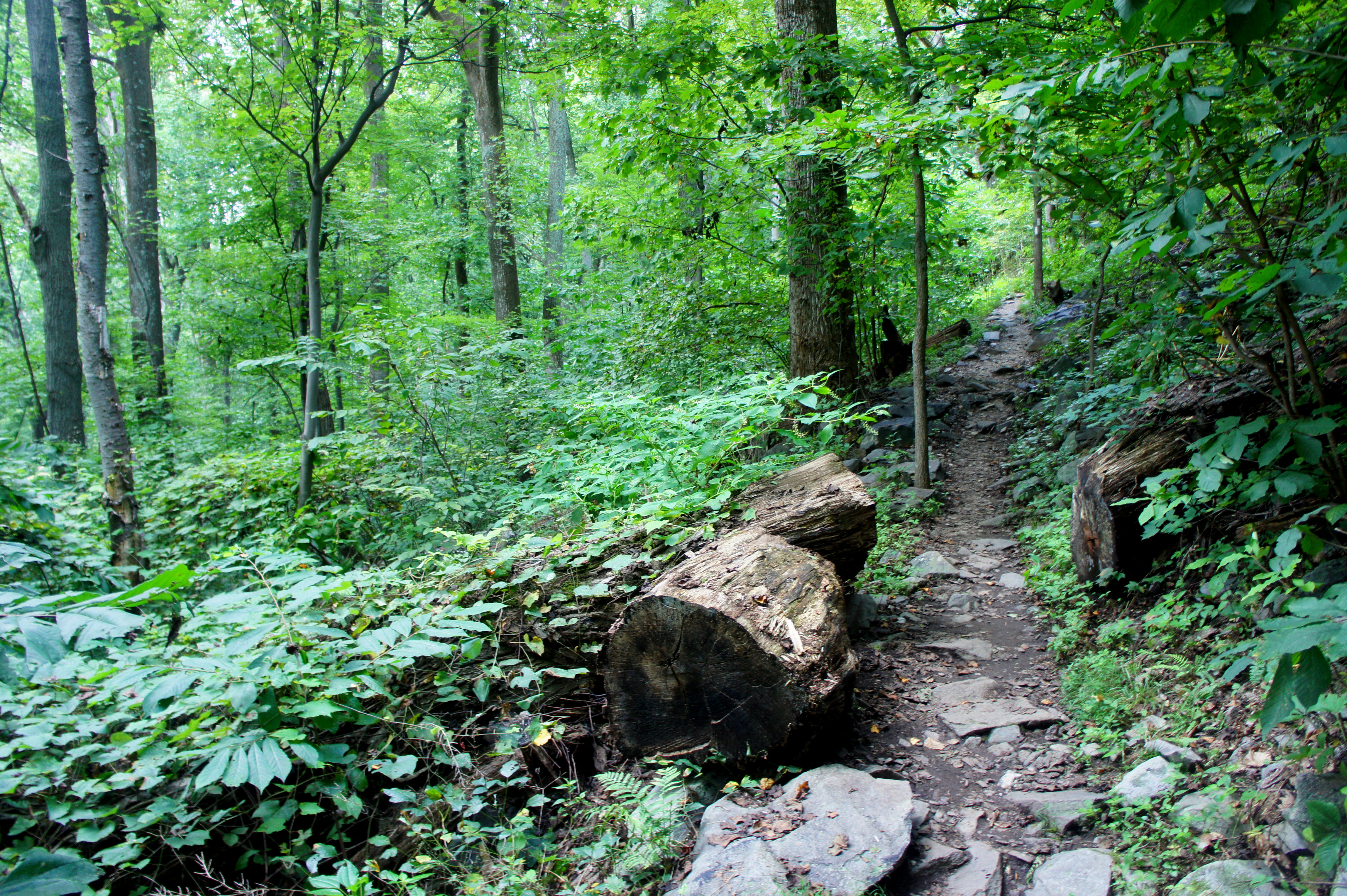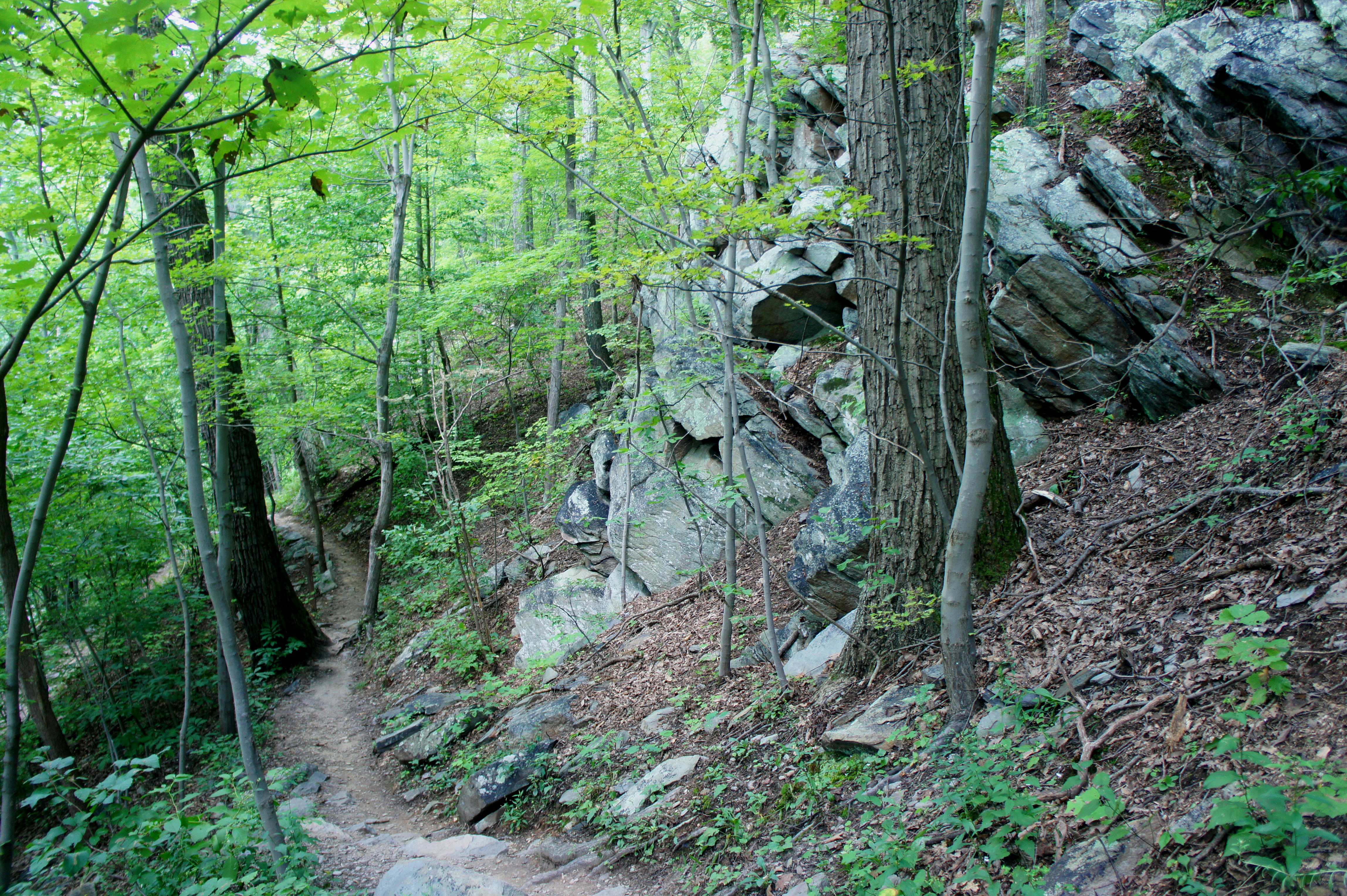 Rocky stairs at the other end of the road mark the beginning of the upward climb. Stop at the trail kiosk on the left for a map of Maryland’s 40 AT miles, then continue up the woody hillside. The incline picks up at around 2/10 mile, but gently sloping bends lessen the burden.