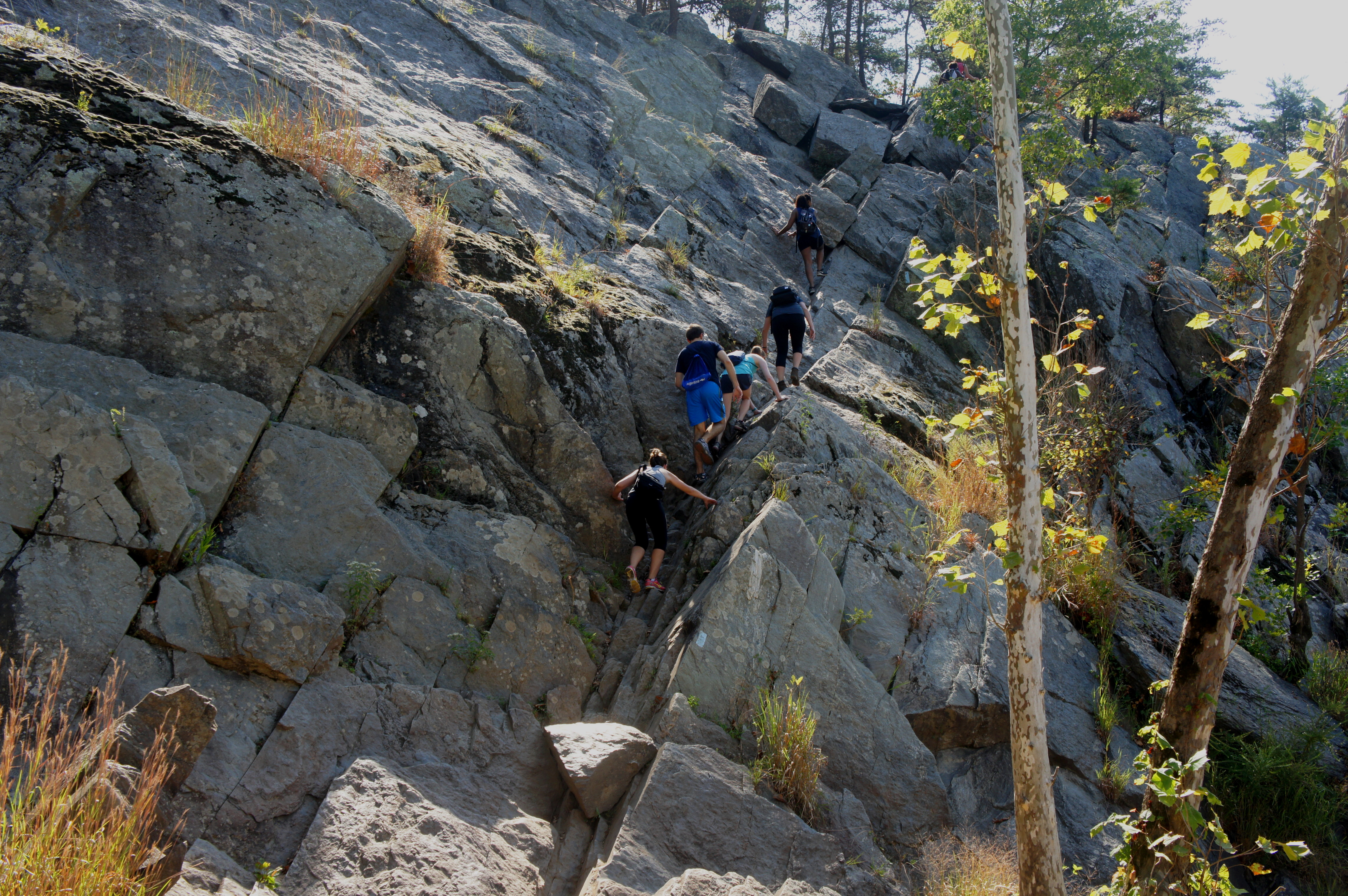 Paralleling the river, at 1.1 miles, the trail approaches a narrow ledge with a few feet of exposure, resembling a far smaller and less foreboding version of the diagonal 50-feet traverse on the Billy Goat’s Section A. As the trail climbs, it hugs the lip of the rock face, then rounds a corner at around 1.2 miles, where hikers pass a rocky promontory that juts out toward the Potomac like a ship’s bow.