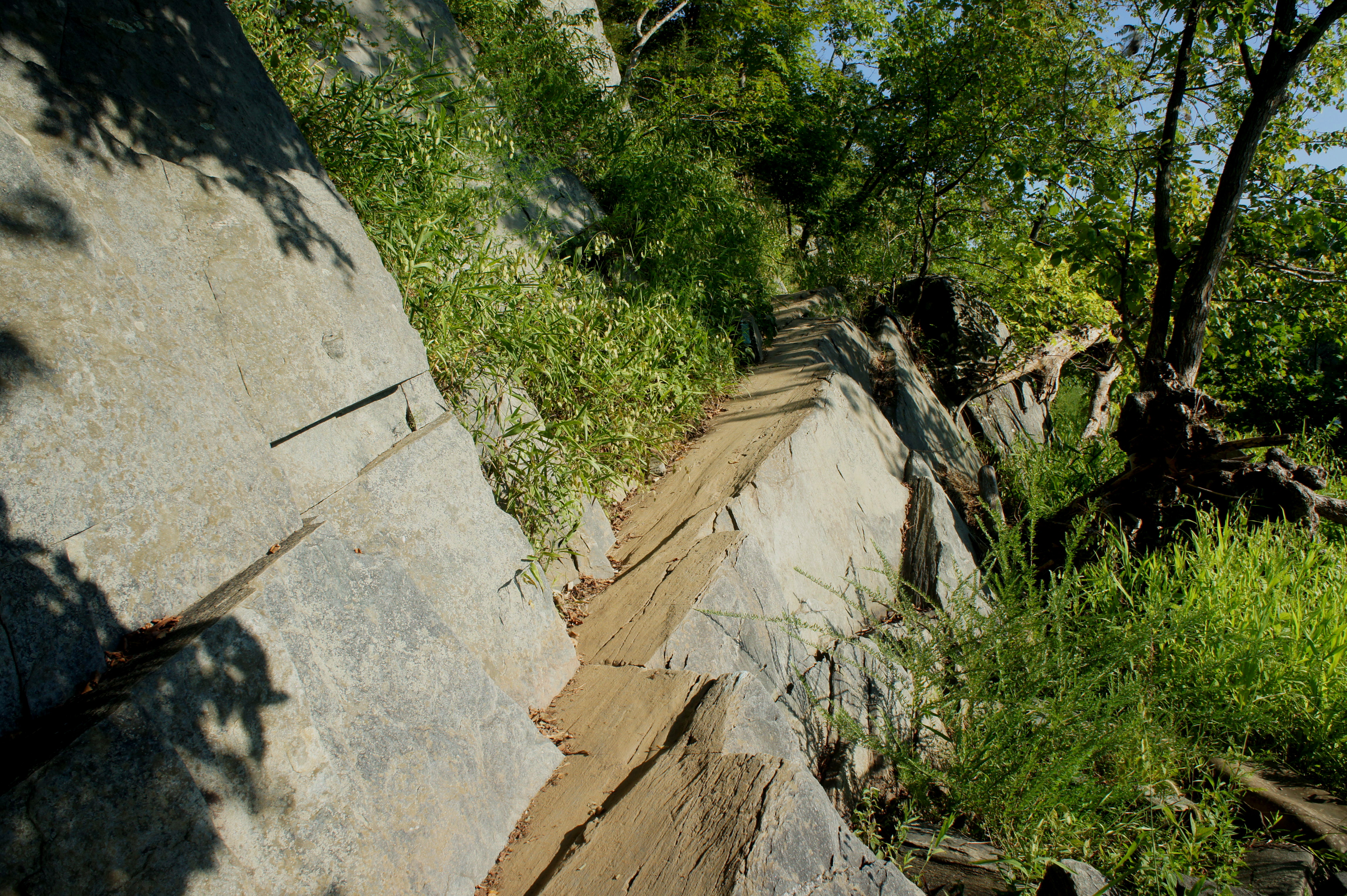 Walk down the Towpath for 1/10 mile, paralleling the C&O Canal on your left, to reach the start of the Billy Goat Trail – Section B. Well-signed, the trail bears off to the right and plunges into the woods, remaining mostly level for the first 1/3 mile as it skirts a ravine and approaches the edge of a rocky cliff face above the Potomac River. In summer, views are largely obscured by tree cover, but there is a fleeting vista to the south just before the trail begins a rocky descent at ½ mile.
