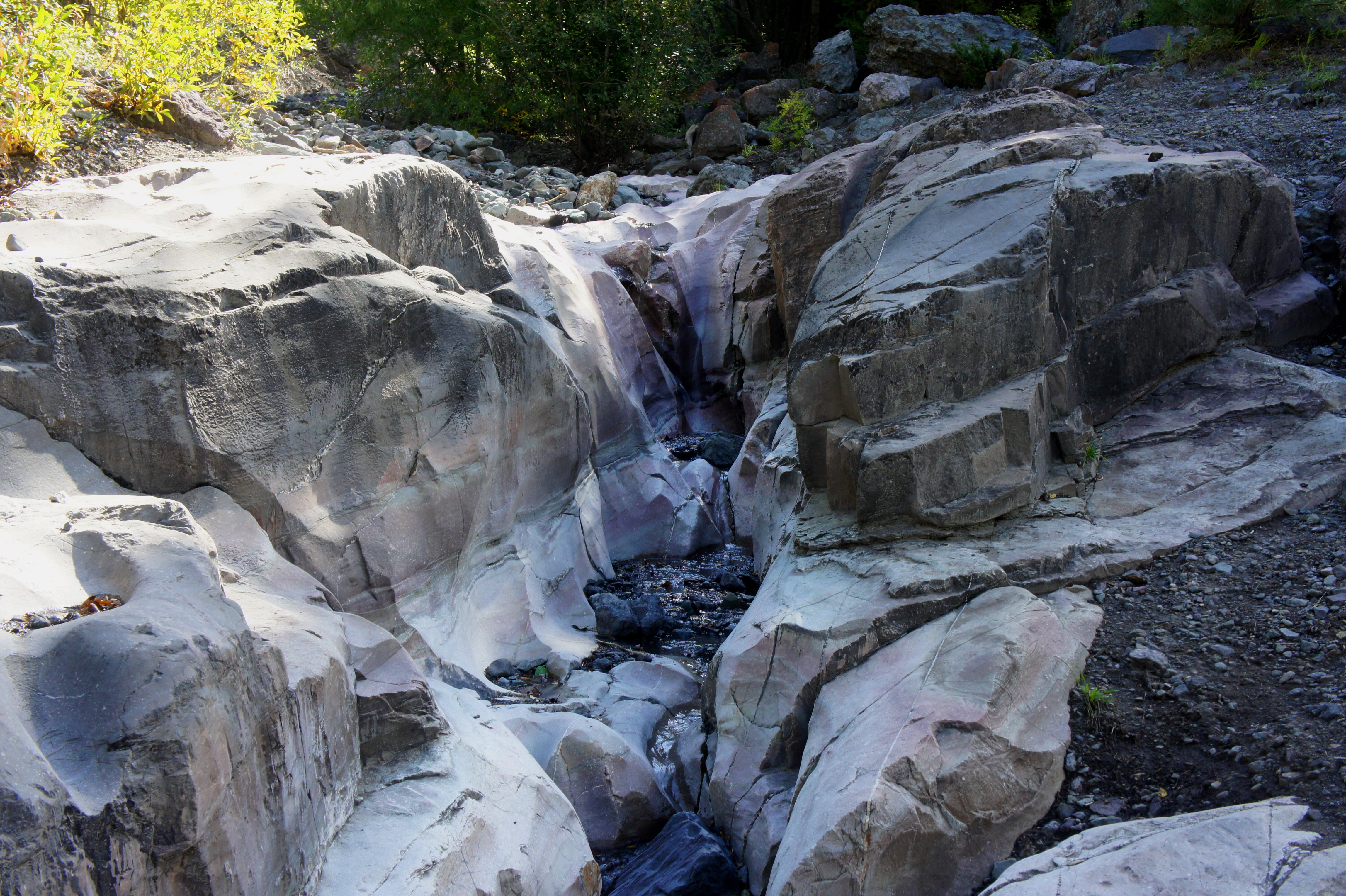 Here the Ouray Perimeter Trail traces the old Baby Bathtub hike upstream through one of the circuit’s most interesting sections. After an initial climb, the narrow footpath approaches an undulating ravine where water has carved smooth curves in the granite bedrock.
