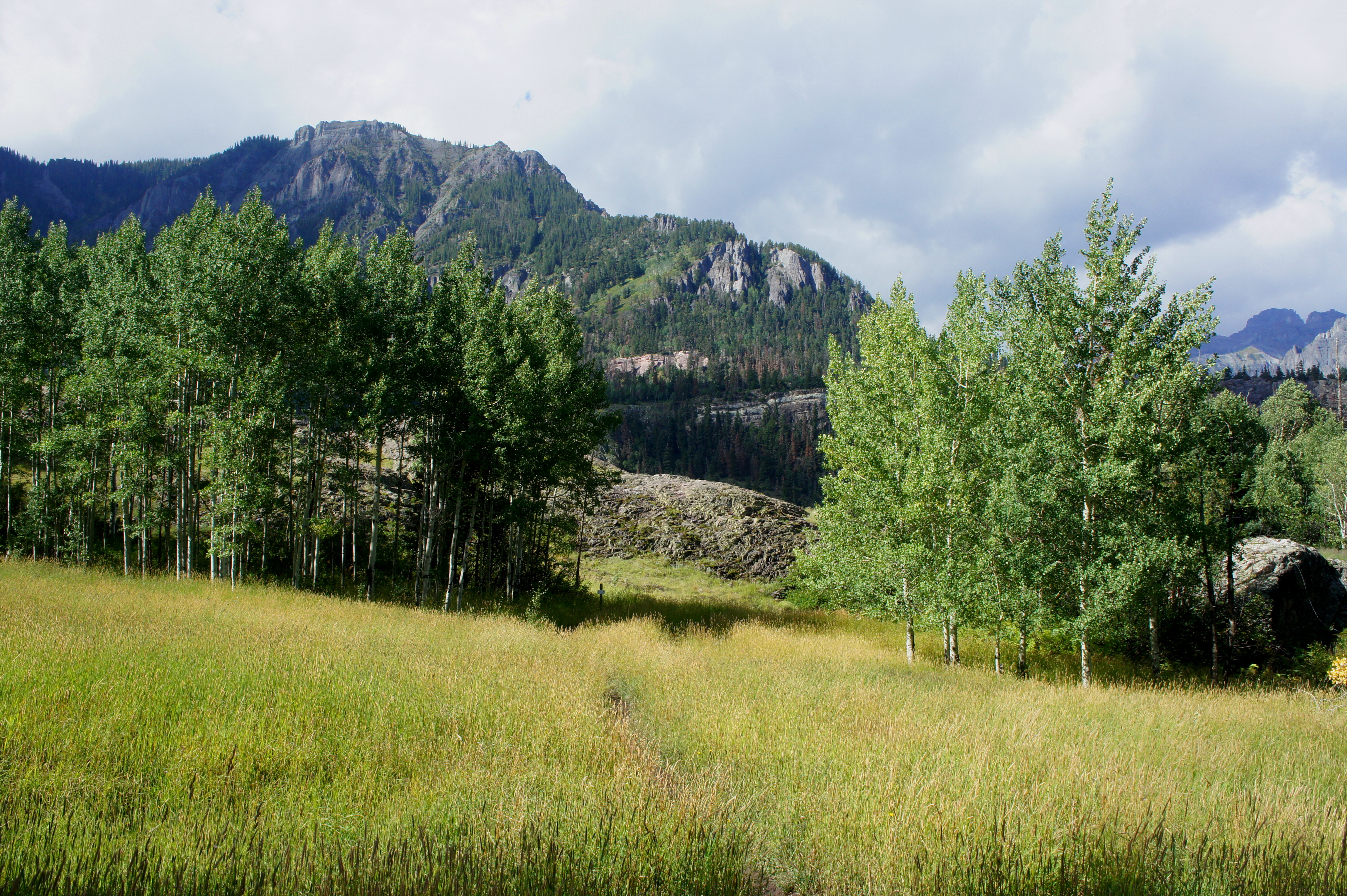 Cresting a small slope, the trail here crosses a beautiful meadow flanked with aspens. The flat fields soon give way to rocky outcrops as the Ouray Perimeter Trail crests ascends to an excellent, unmarked viewpoint at 2.1 miles.