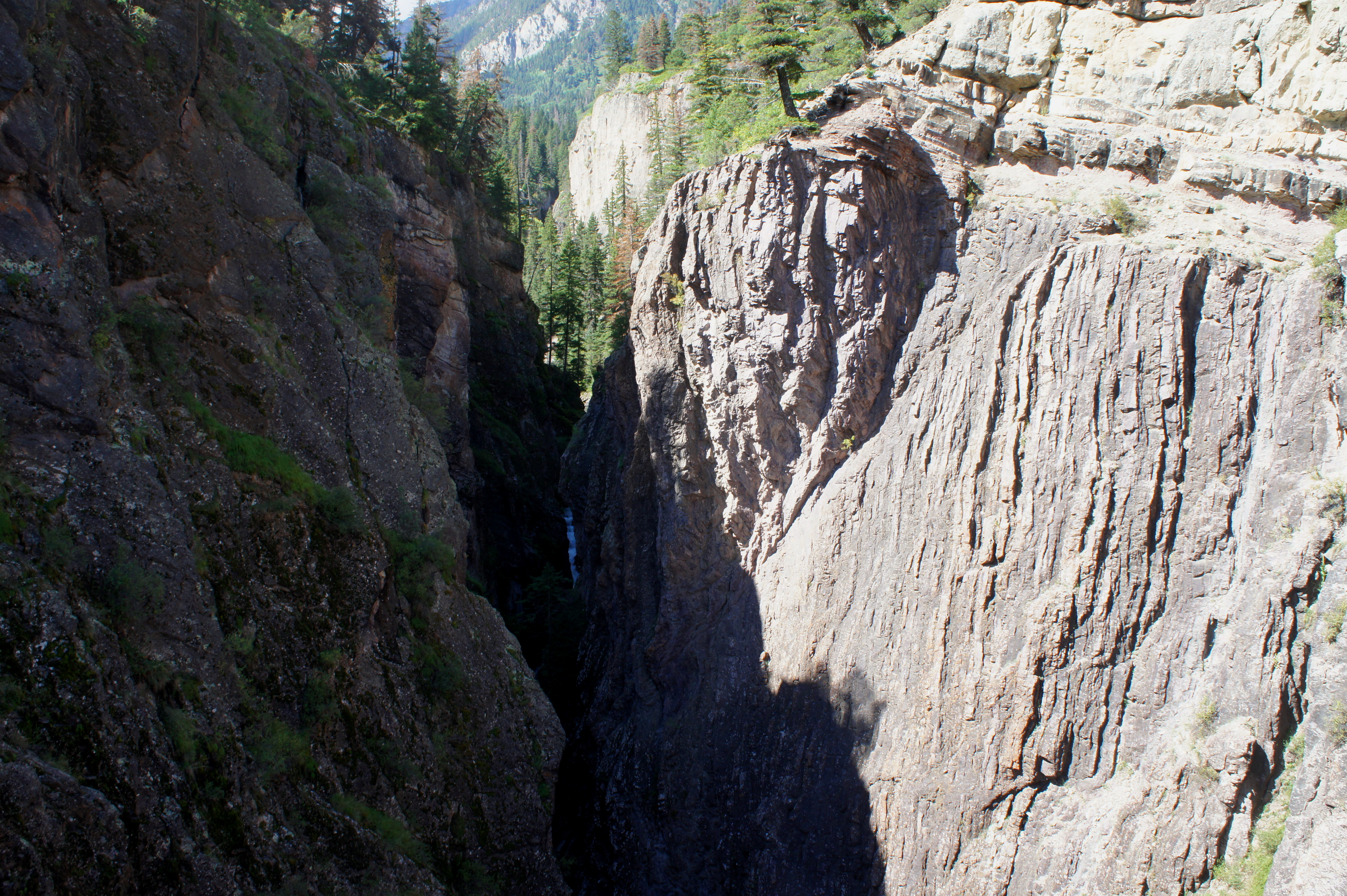 From here, take a left, crossing the road bridge over Uncompahgre Gorge, a curvy canyon fed in part by a rerouted waterfall that comes in from to the right. About 250 yards from the end of the Ice Park Trail, the Ouray Perimeter Trail continues again on the right.