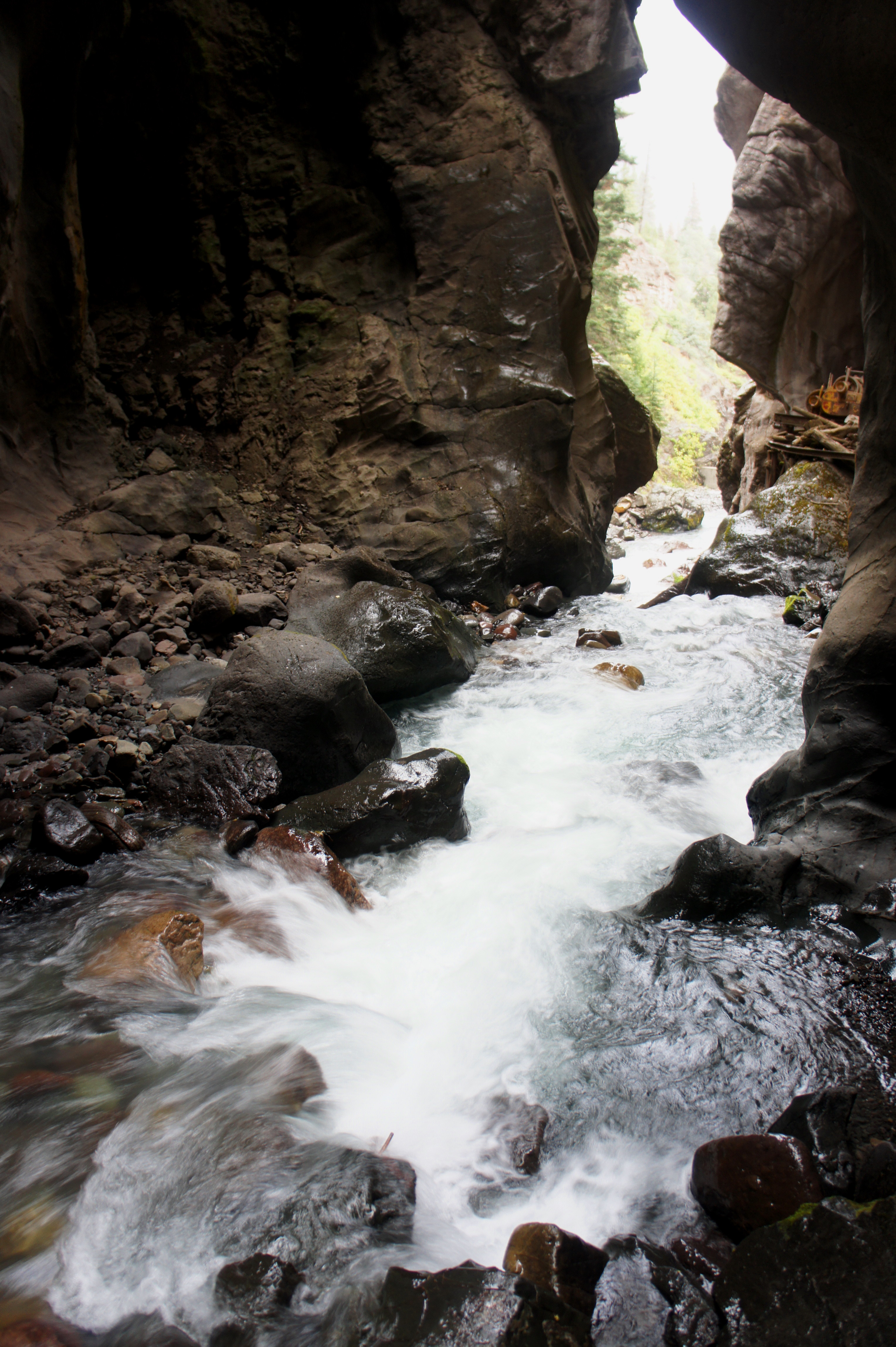 At the foot of the staircase, the trail enters the narrow gorge, carved by Canyon Creek. The box canyon—and falls—owes its existence to the Ouray Fault, where a mix of sedimentary and metamorphic rock layers drop some 200 feet; the canyon has slowly whittled away at the exposed quartzite, here a charcoal color due to the presence of tiny iron oxide flakes. Putting the Mesozoic layers (deposited 252-66 million years ago) of southern Utah to shame, this Precambrian era-rock dates to at least 550 million years ago.