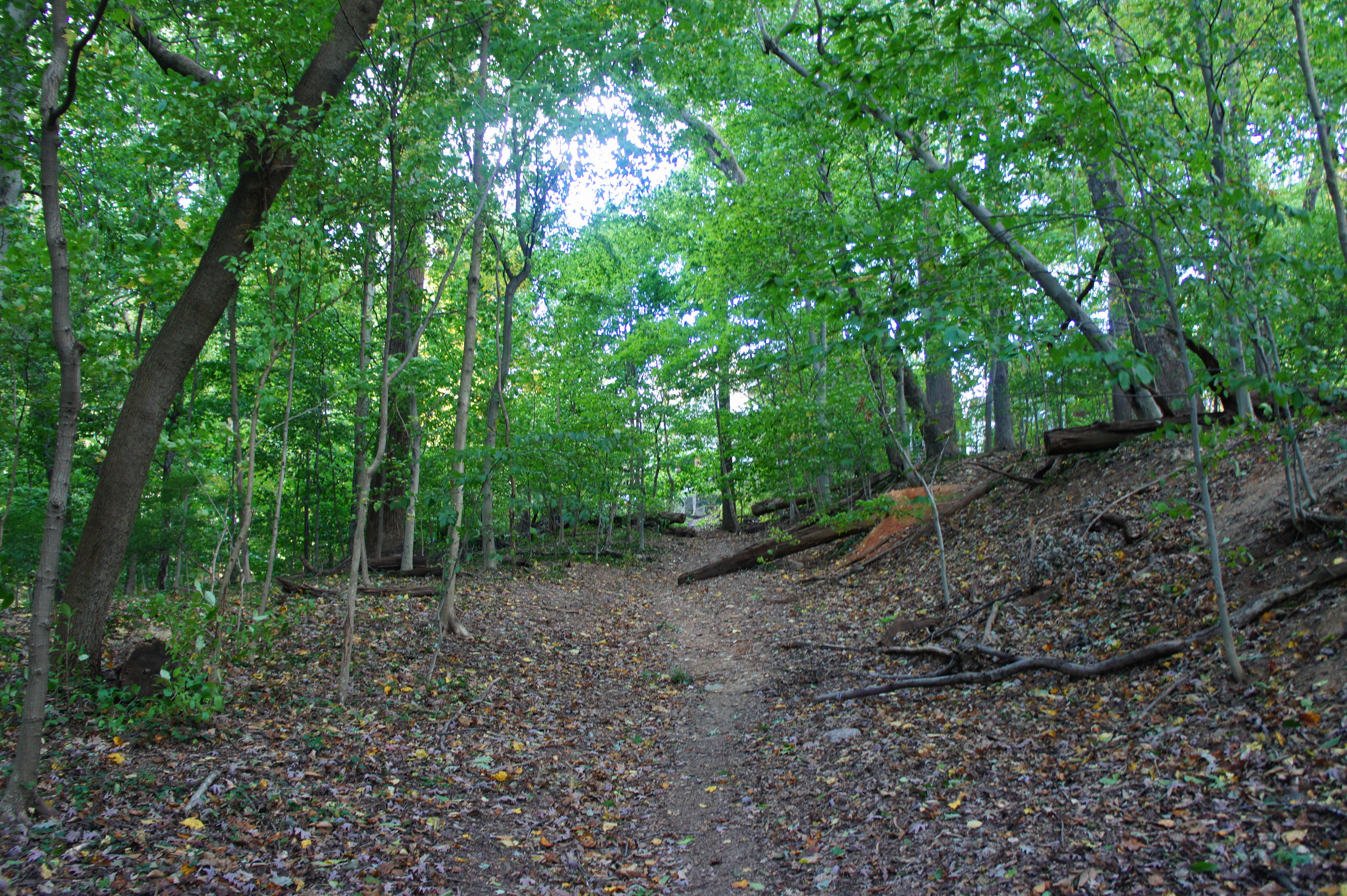 Beginning from the end of Rosemont Avenue, bear left on the dirt track heading into the park. Quickly the sight of houses is replaced with that of towering hickories and oaks and beech trees. Come to the first, unmarked fork after around 70 yards. Here a dusty trail drops sharply down to the right into a woody gully; stay left on the rambling and faded path, which skirts the edge of ravine in the shadow of the Rosemount Center up the hillside to the southeast.