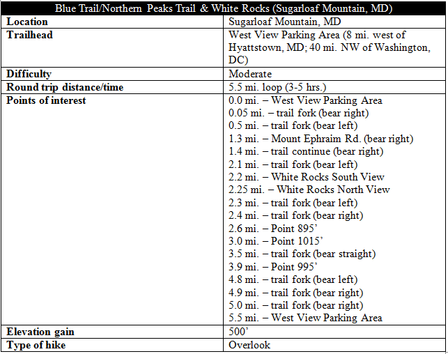 Maryland’s Sugarloaf Mountain, the area’s best known example of a monadnock, features a network of zigzagging trails, just an hour’s drive from Washington, DC. While climbing Sugarloaf itself is the park’s key attraction, the Blue Trail (a.k.a. Northern Peaks Trail) triples the fun with rocky climbs to three nearby summits, plus a short detour to White Rocks, a fantastic set of viewpoints overlooking Frederick Valley to the west. Clocking in at about 5.5 miles, this loop hike provides a fine introduction to the park at Sugarloaf, protected and managed by the trustees of Stronghold Incorporated since 1946.