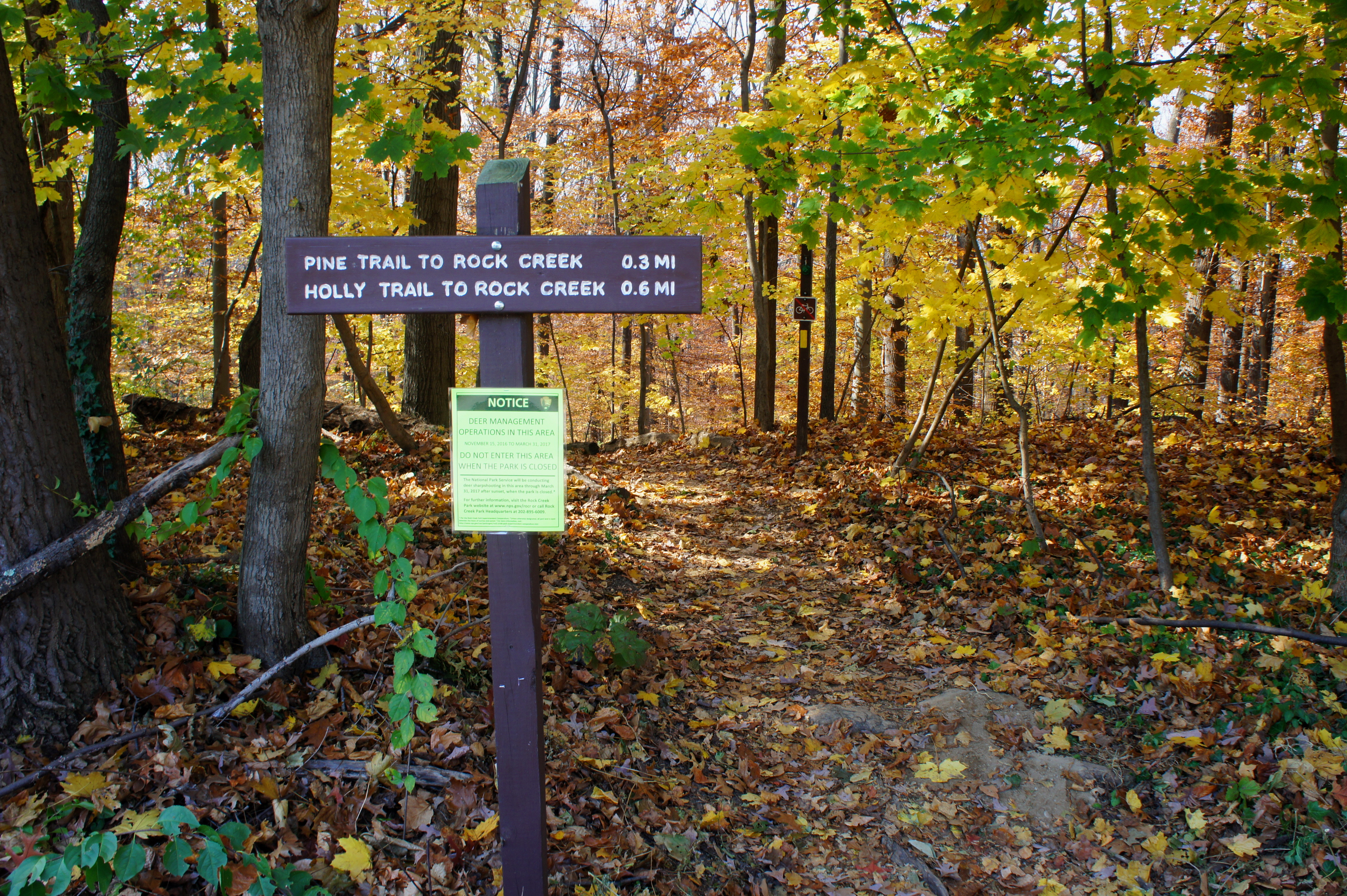 Situated in Rock Creek Park’s wild northern section, the Pine-Holly Loop traces a 1.5-mile circuit in the woody pocket between the creek and 16th Street in Washington, DC. Although the scenery is modest, this short hike is easily accessed by city dwellers, beginning and ending at 16th and Holly, located on the well-trafficked bus line between downtown and Silver Spring, Maryland.