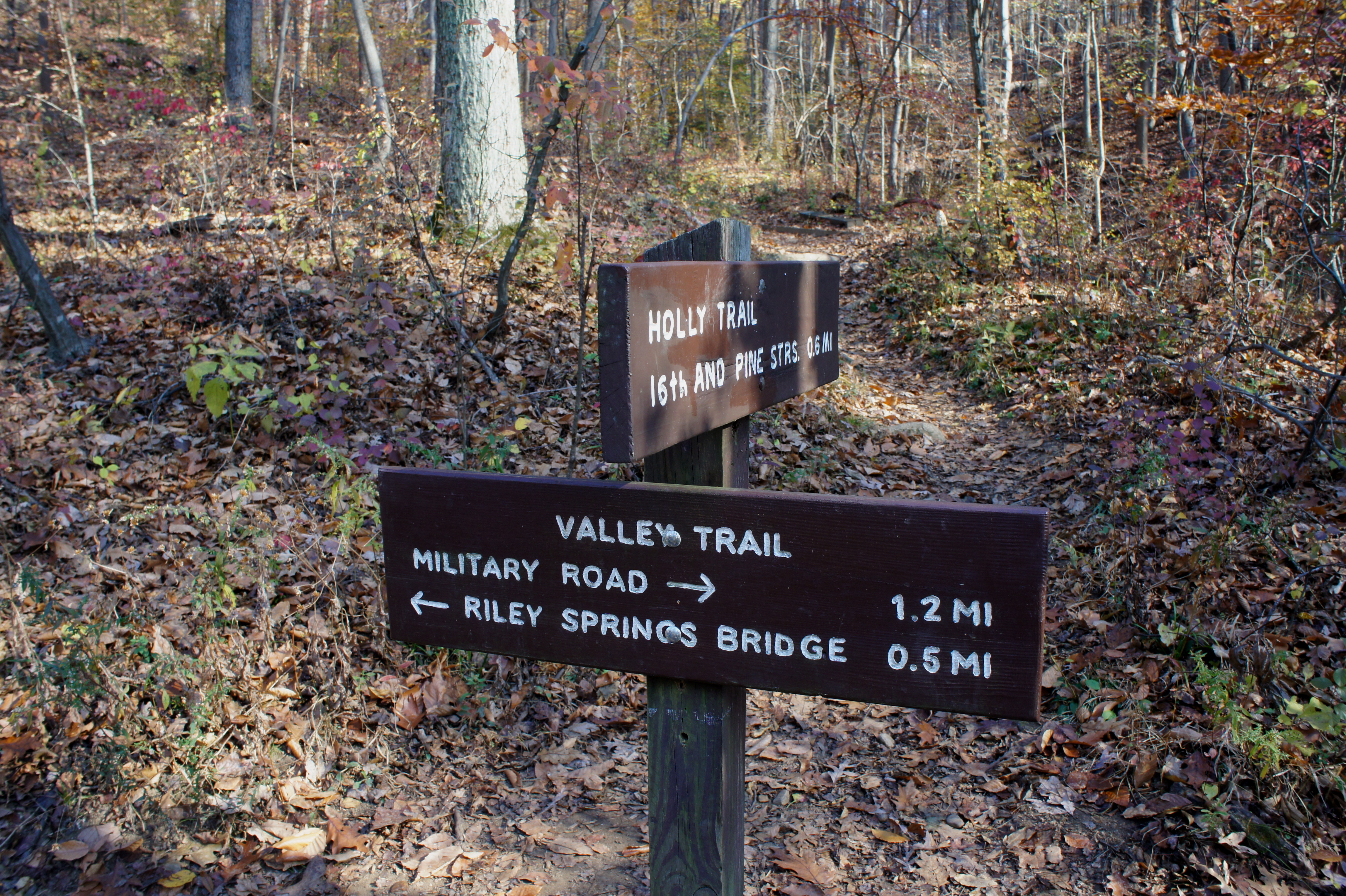 Taking the S4 or D31 bus up 16th Street from downtown DC, get off at the 16th and Geranium Street stop and walk one block north to Holly Street. Crossing 16th to the west side, look for a wooden sign marking the trailhead.