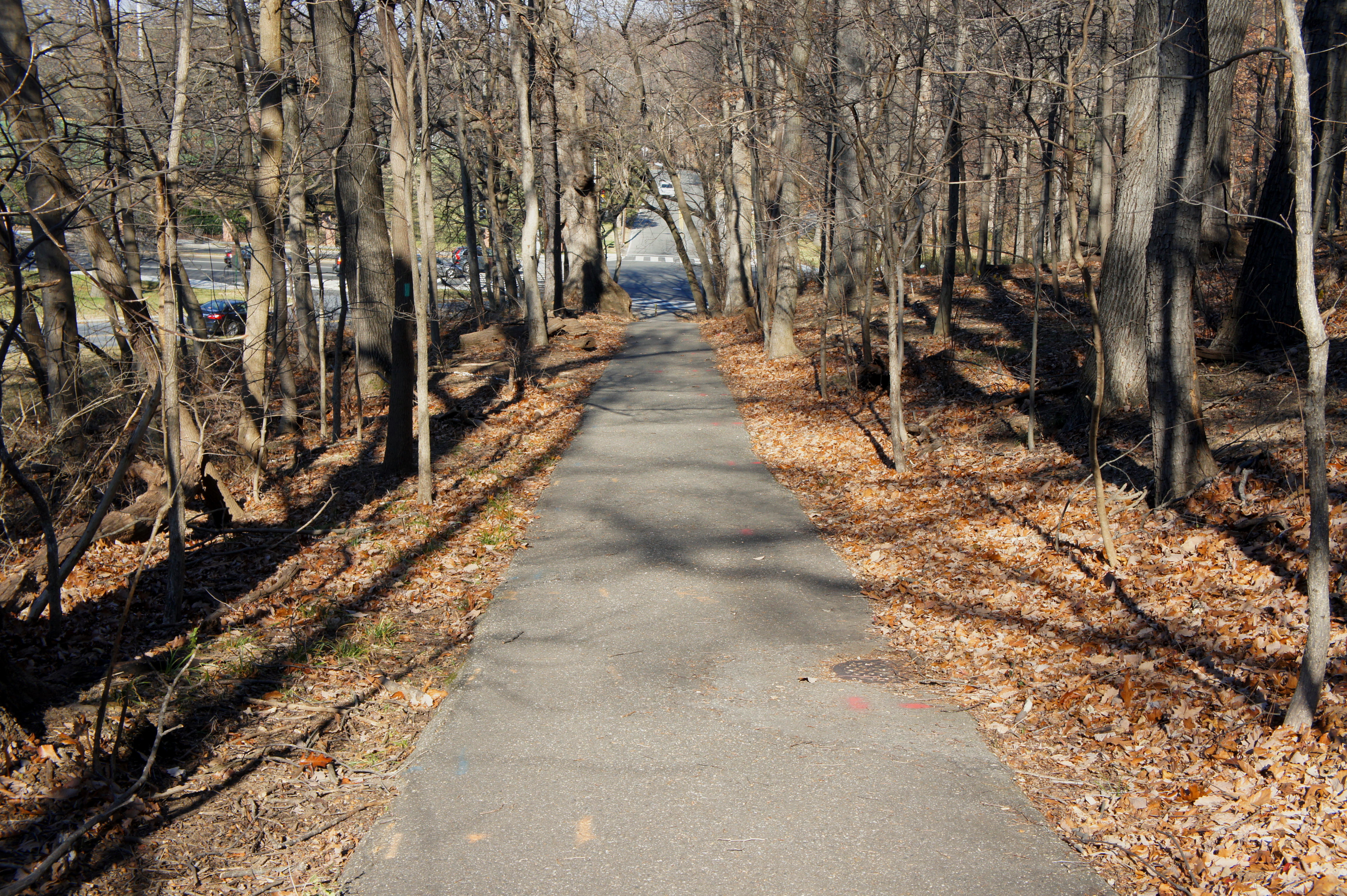 Now you are back on the Western Ridge Trail, which you will follow all the way back to the Nature Center. From here the trail skirts the west flank of the hillside on which Fort DeRussy sits, with views across Oregon Avenue toward St. John’s College High School. After cresting a low ridge, the path drops to meet the Fort DeRussy Trail. Take a right and continue downhill to meet the paved path again; you are now retracing your steps from early in the hike. Bear right, and then turn left toward Military Road. After crossing the road, you are in the final stretch: a steady uphill back to the Nature Center and original parking area.