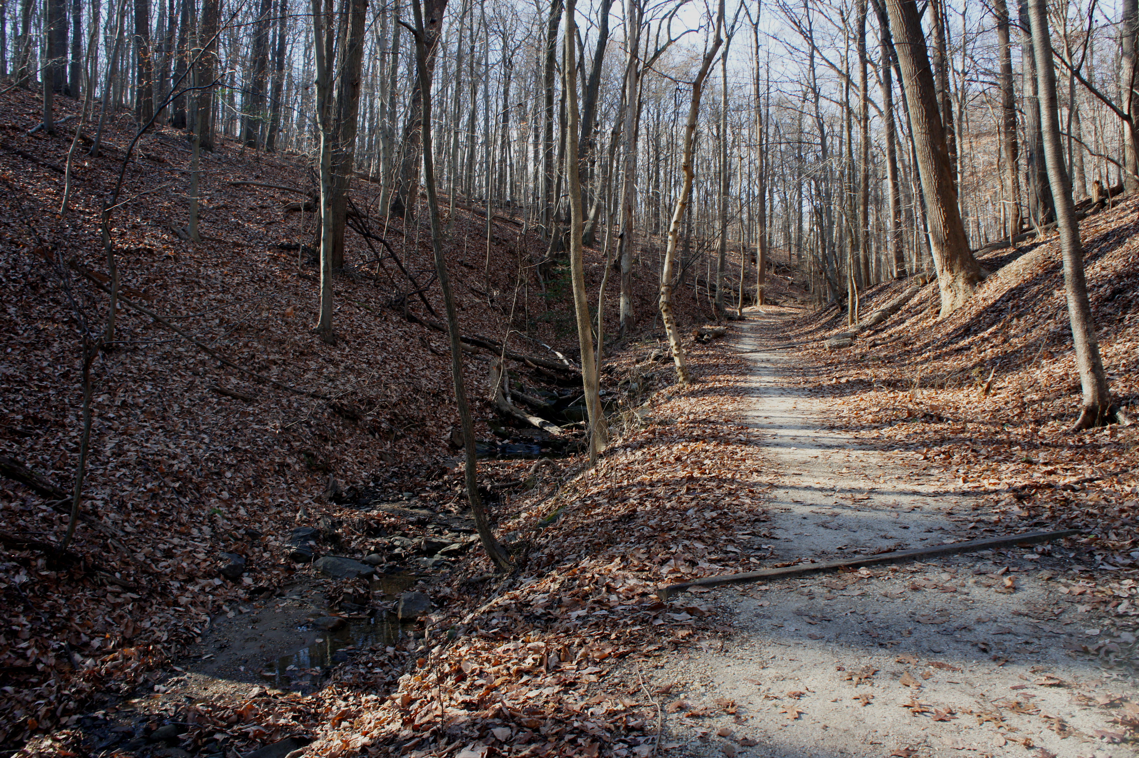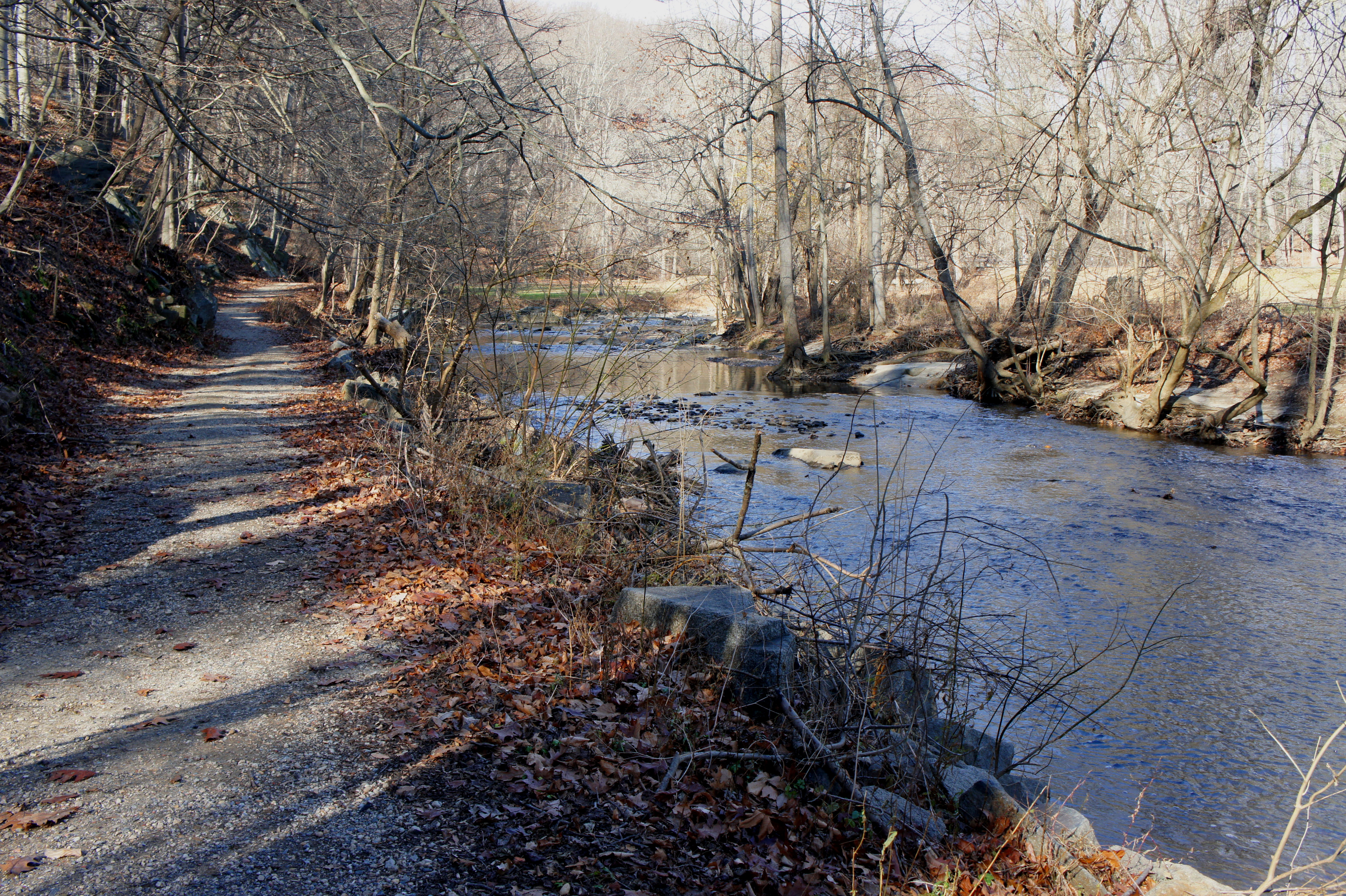 Returning to the main trail, take a left and continue around the remainder of the loop. Amid chestnuts, oaks, tulips, and beech trees, the Fort DeRussy Trail gradually descends a woody ridge, then drops sharply at about 6/10 mile to within striking distance of Military Road again. After briefly paralleling a paved path (below on the right), the trail forks at ¾ mile. Bear left and continue northwest as the trail descends to meet the banks of Rock Creek at 9/10 mile.