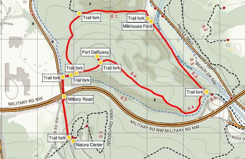 Steps later, you will encounter a four-way junction; stay straight on the paved route, which has now merged with the lengthy Western Ridge Trail. Bearing downhill, you will meet the buzzing Military Road at 1/10 mile; use the crosswalk to reach the other side, where the pavement continues past a large sign, which indicates that you are entering the Fort DeRussy section of Rock Creek Park.