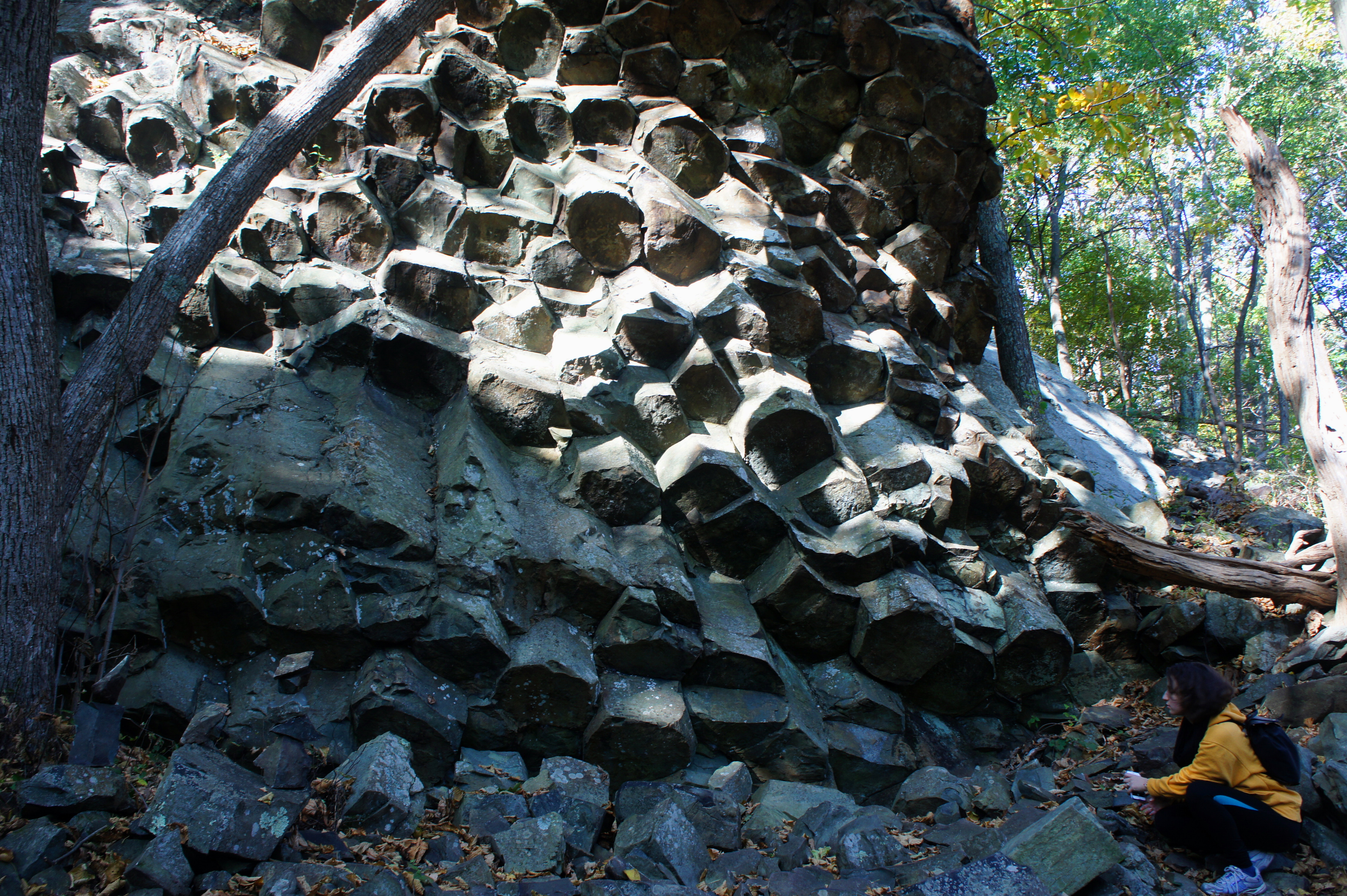 This short hike to the summit of Compton Peak offers panoramic views of Virginia’s Shenandoah National Park, but the real gem is a minor detour to a spectacular exemplar of columnar jointing, a geologist’s El Dorado. Here a huge chunk of fractured basalt has been flipped nearly upside down by weathering of the Blue Ridge Mountains, revealing a spectacular and photogenic array of hexagonal columns that is highly unusual to the area.