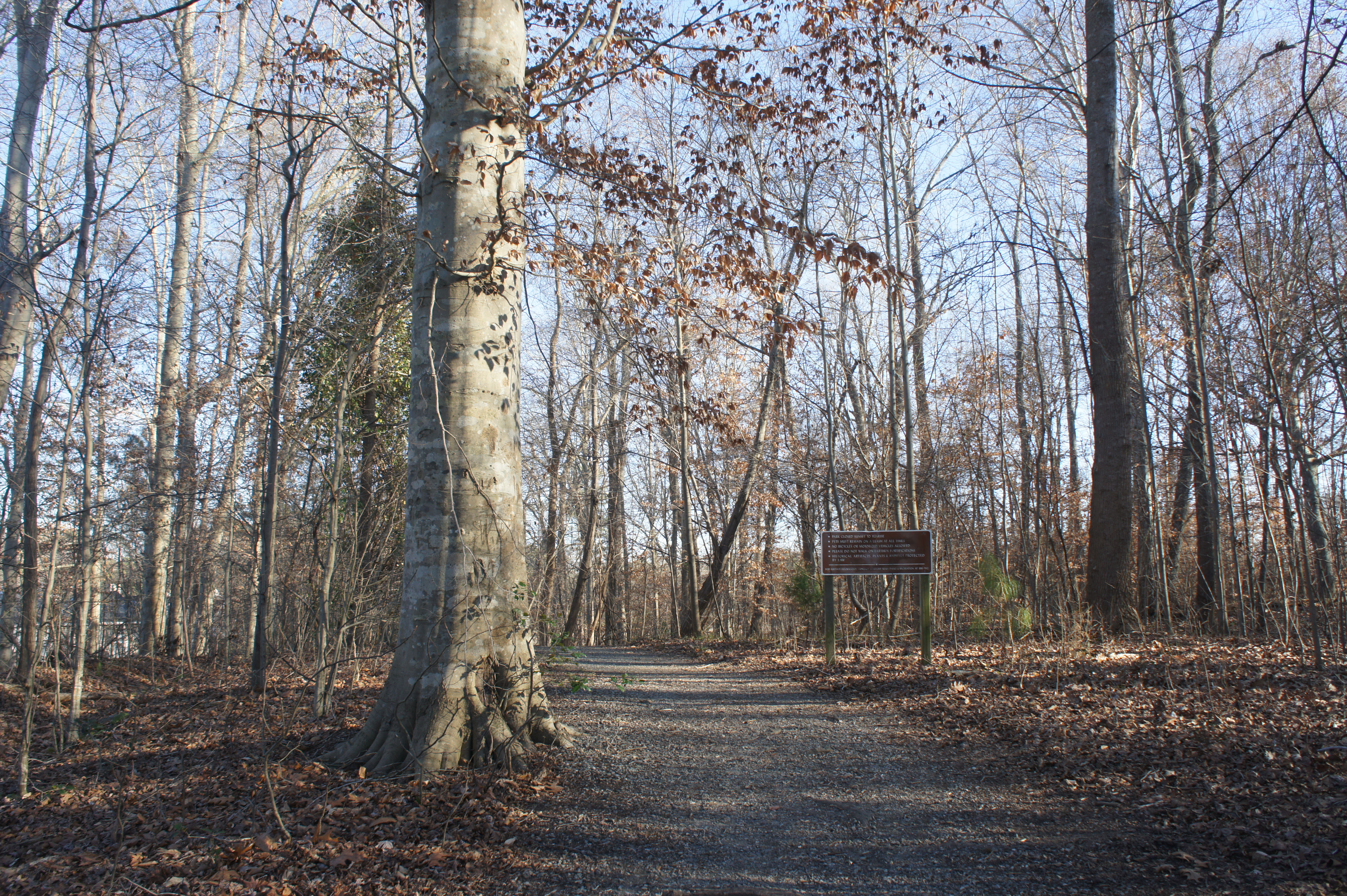 From the parking area, bear left onto a wide, partly graveled track heading into the woods. Weaving amid oak, hickory, and beech trees, the trail crests a minor hill then descends gradually to a trail fork after 100 yards. Here a second sign tells the story of the construction of the Confederate earthworks at Lee’s Mill, which were influenced by French military engineer Marshal Sebastian le Prestre de Vauban.