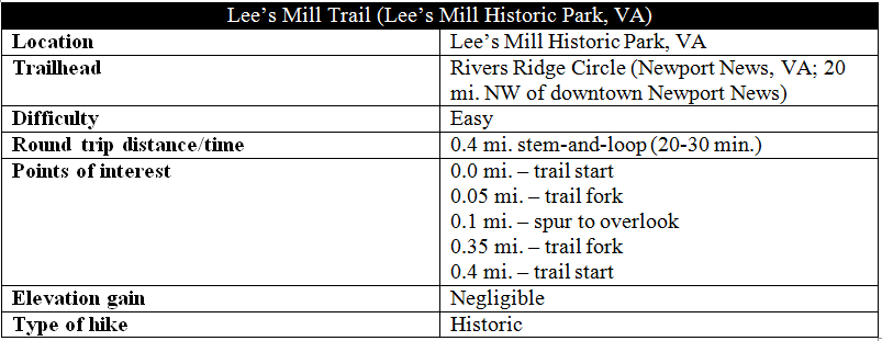 The trailhead is not far from the intersection of Interstate 64 and Virginia State Route 105 (exit 250) in Newport News. From busy Warwick Boulevard, turn onto Lee’s Mill Road, heading southwest into a residential neighborhood. Drive 1/10 mile and turn left on Rivers Ridge Circle, bearing around the curve for 2/10 mile until you spot a small parking area for Lee’s Mill Historic Park on the left. A Civil War Trails sign at the parking area gives an overview of the battle.