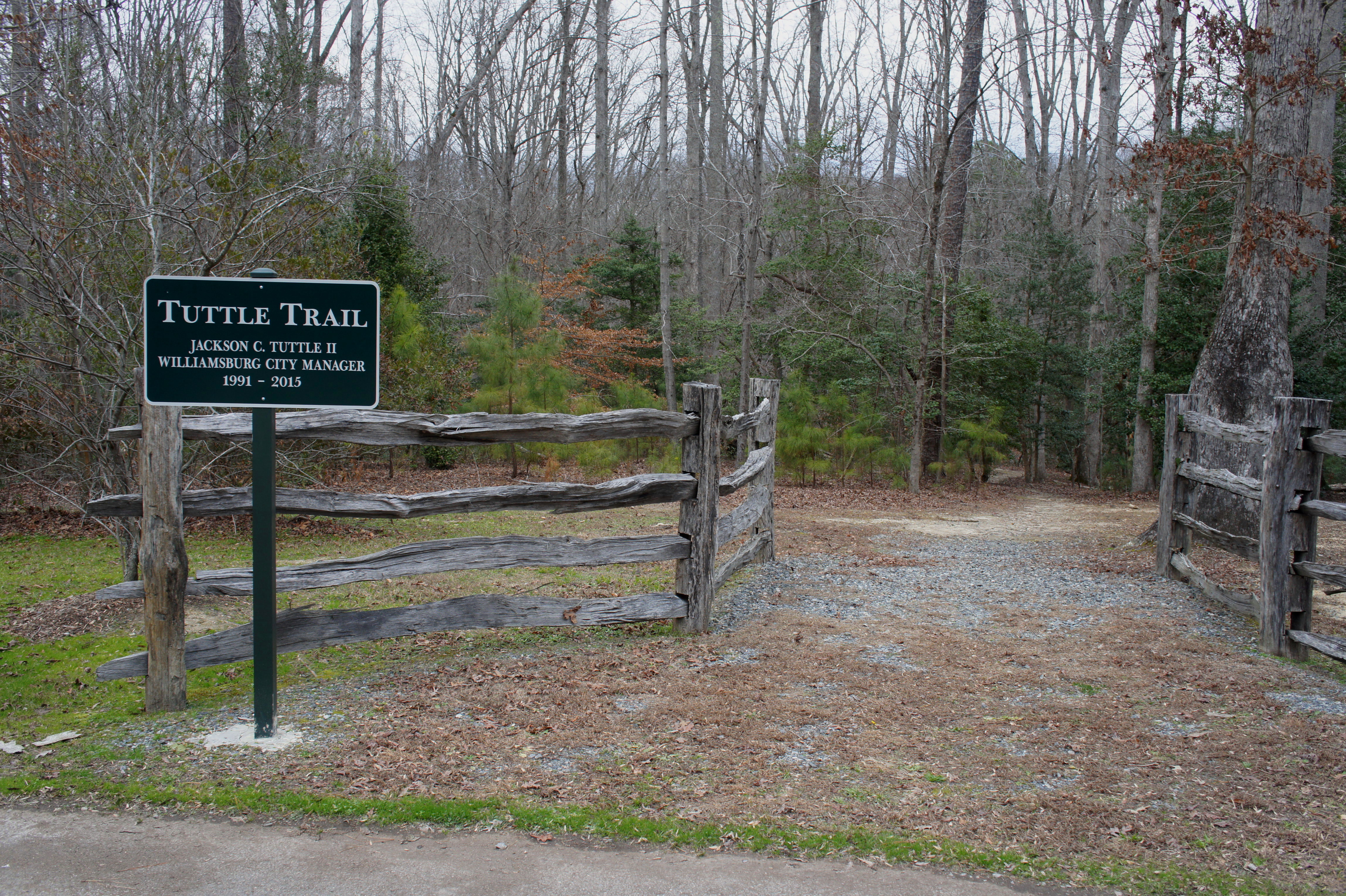 Named for a long-time Williamsburg city manager, the Tuttle Trail immediately plunges into the woods but quickly takes an odd turn in which the dusty path nearly doubles back on itself. After this initial twist of switchbacks, the trail descends a minor ravine and crosses the first of three wooden bridges at 0.15 miles. From here the trail crests a ridge and then descends a set of stairs to cross a second bridge at the ¼-mile mark.