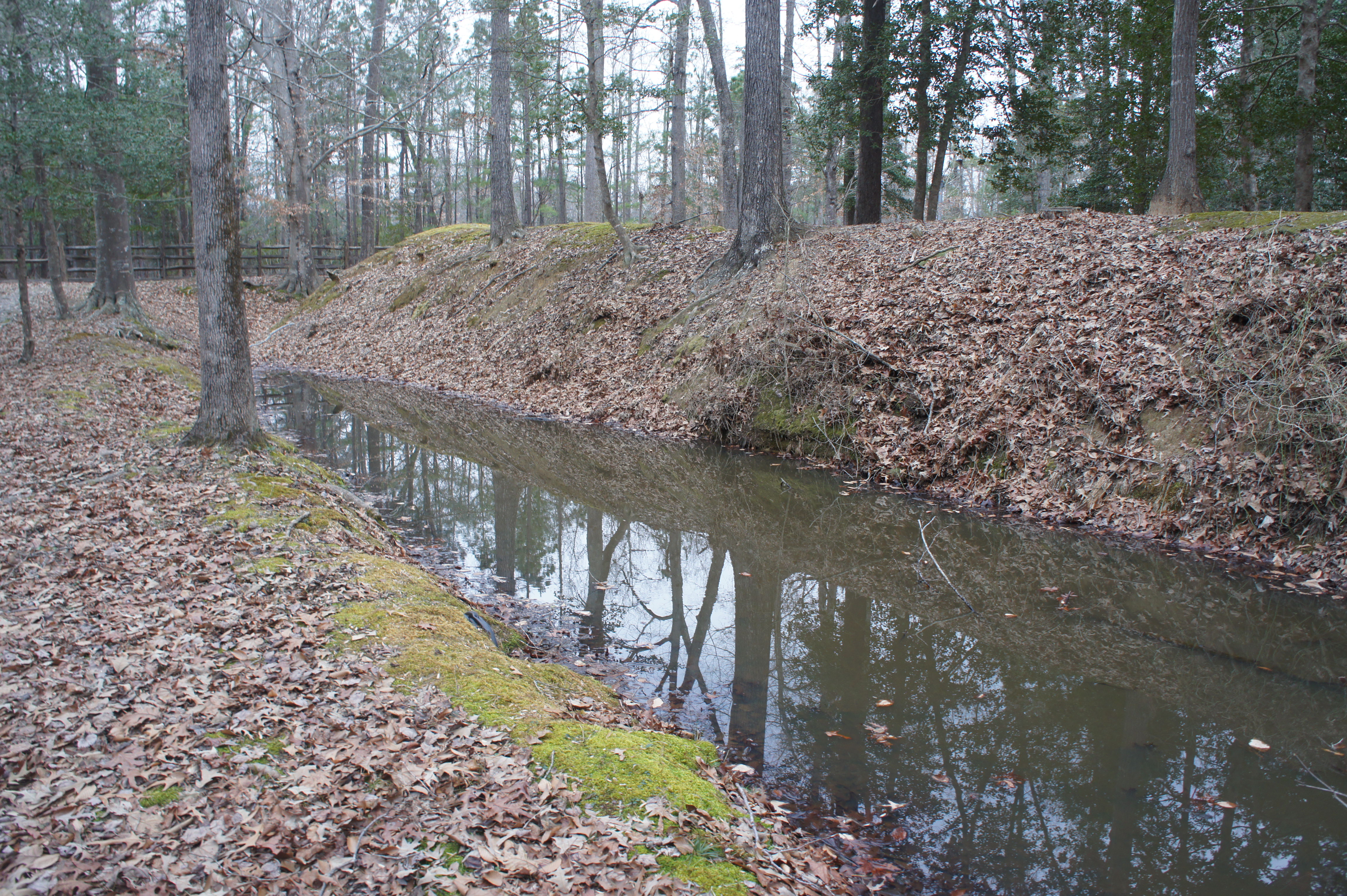Though incomplete on the eve of battle, Redoubt 2 comprised a relatively significant surface area and an impressive surrounding ditch (which, after rains, doubled as a moat). Bearing left, the trail skirts the edge of the ditch then crosses a bridge to enter the earthworks; here a second sign includes a scan of an old map of the Williamsburg Line—the 14 redoubts comprising Magruder’s third tier of defenses. While the redoubt saw no fighting during the war, Gen. James Longstreet’s 17th Virginia crossed Quarterpath Road, just to the north of here, on the day of the battle on May 5, 1862; the regiment was en route to the battle lines at Bloody Ravine. The redoubt also hosted a small battery.