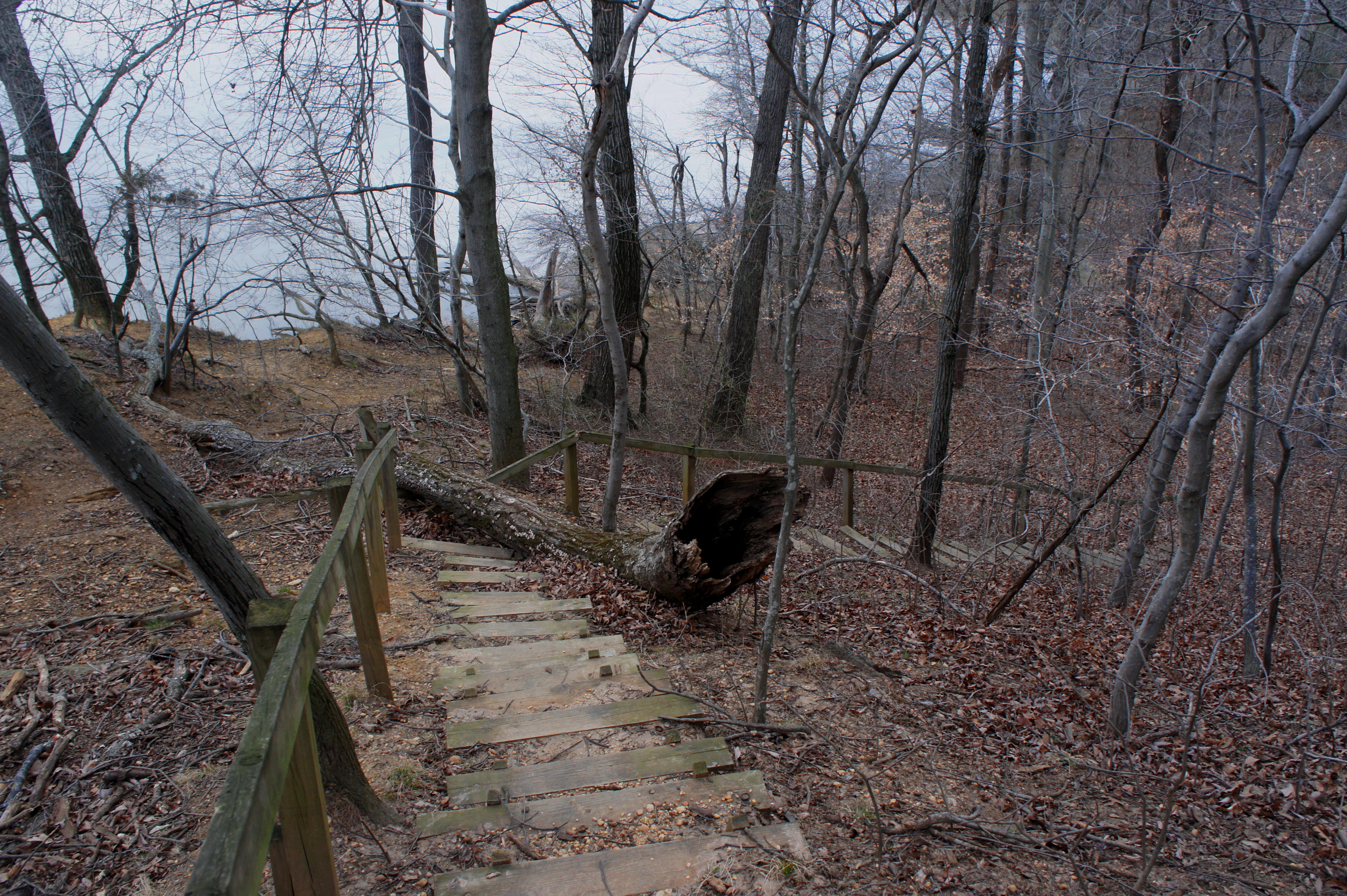 From the rifle trench, the River Trail begins the first of two significant climbs. Stay left at the junction, then ascend a set of wooden steps to clear a modest bluff. Stay right at the next fork, then descend sharply into another gully. Cross over a muddy stream, approaching another junction—stay straight this time. Climb a steep and lengthy set of stairs and enjoy the partly-obscured view of the Potomac from atop the ridgeline.