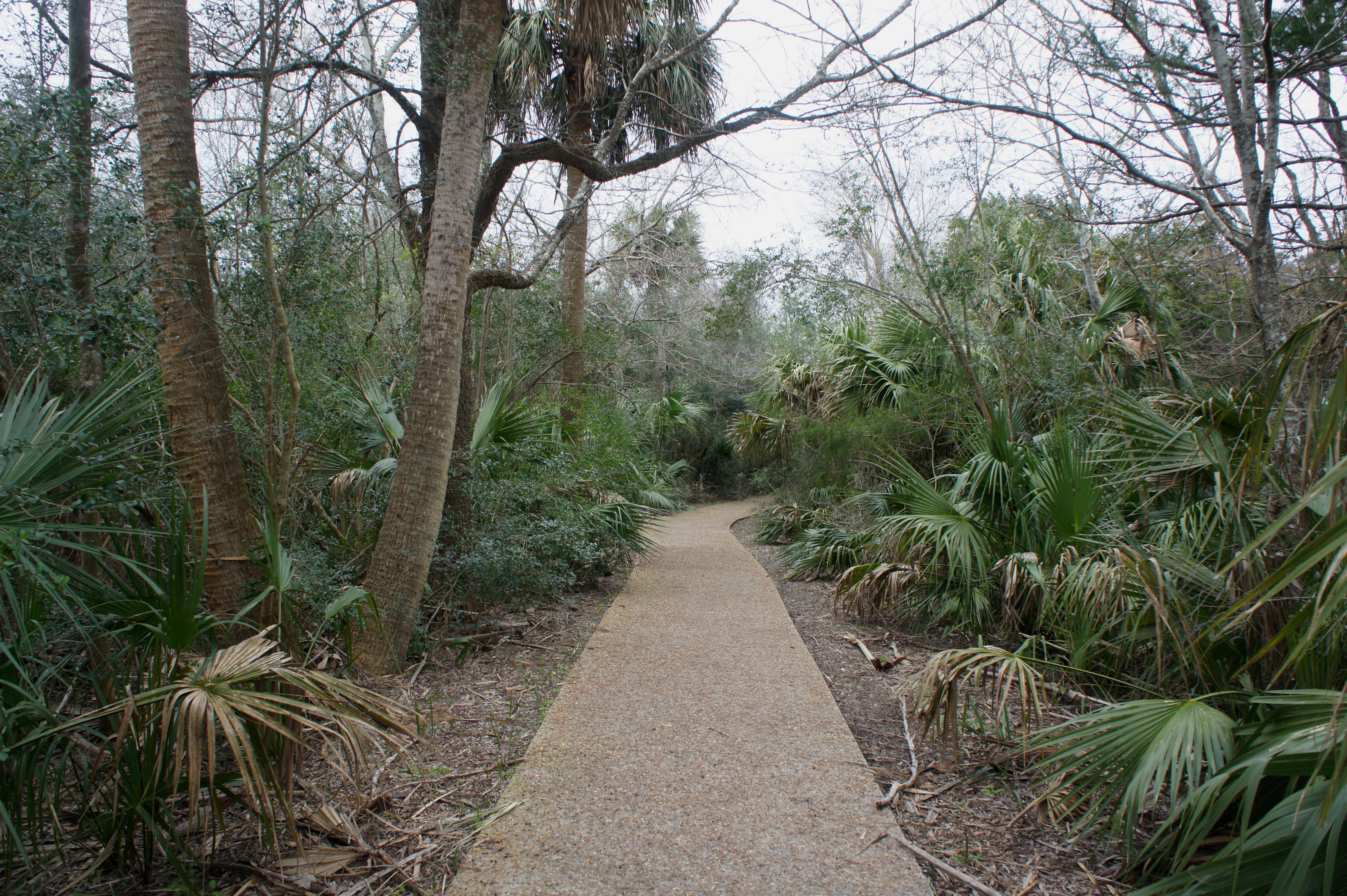 After visiting the fort, return to the parking area and look for a large sign marking the start of the North Pier Trail, at the northwest end of the lot. Here, just beyond the trail panel, a wide and paved path plunges into the coastal forest, revealing wily branches, dense thicket, and flashes of palms. It’s flat and straight for the first 100 yards, after which the trail forks. Stay left to head toward the North Pier viewpoint.