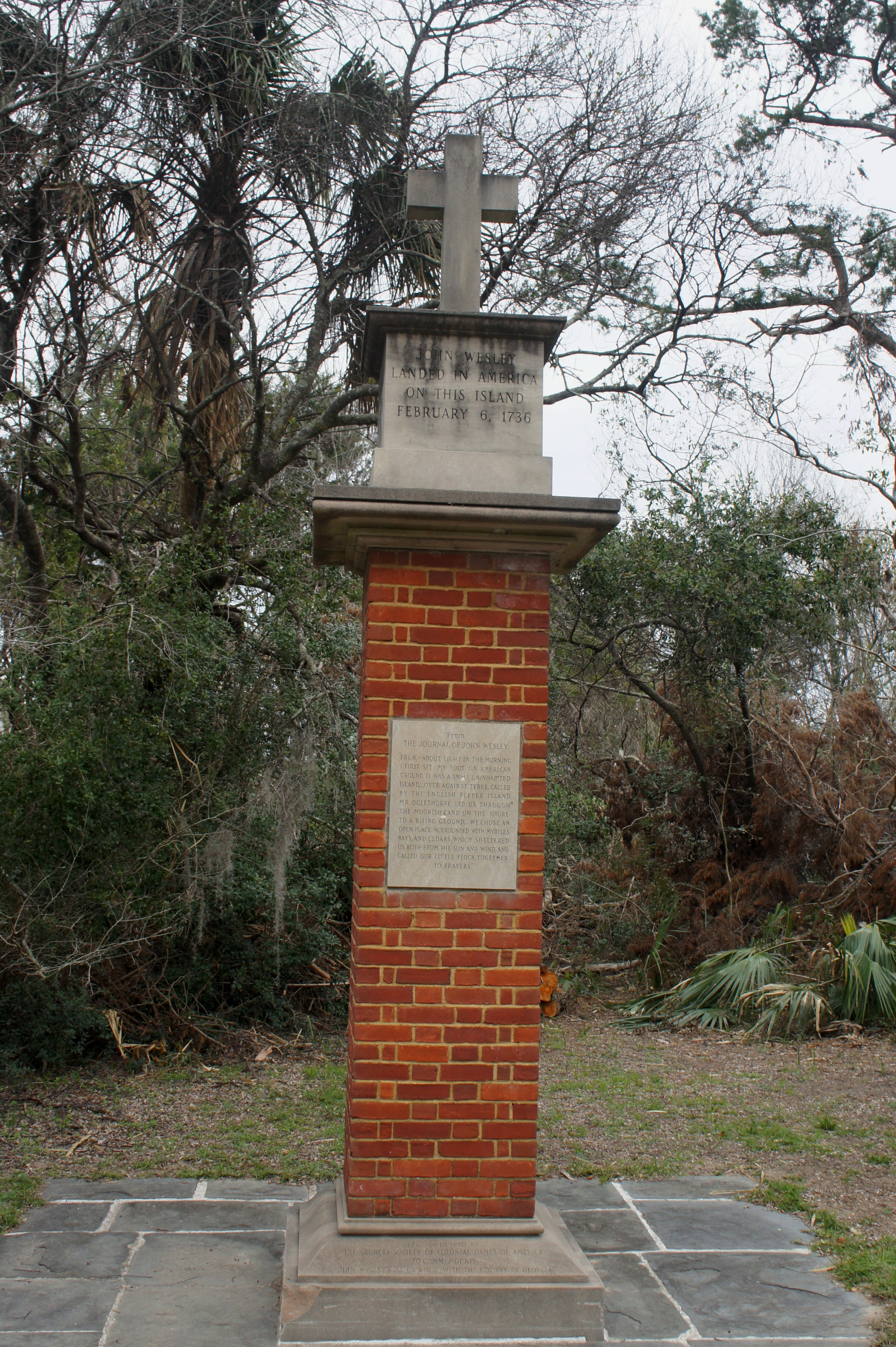 Once finished at the pier, double back to the second trail junction and bear left on a paved side route, which arcs around the grassy backside of Battery Hambright. This trail, which quickly reenters the thicket, leads to the John Wesley Memorial, a tribute to the founder of the Methodist Church who landed on Cockspur Island from Britain in 1736.