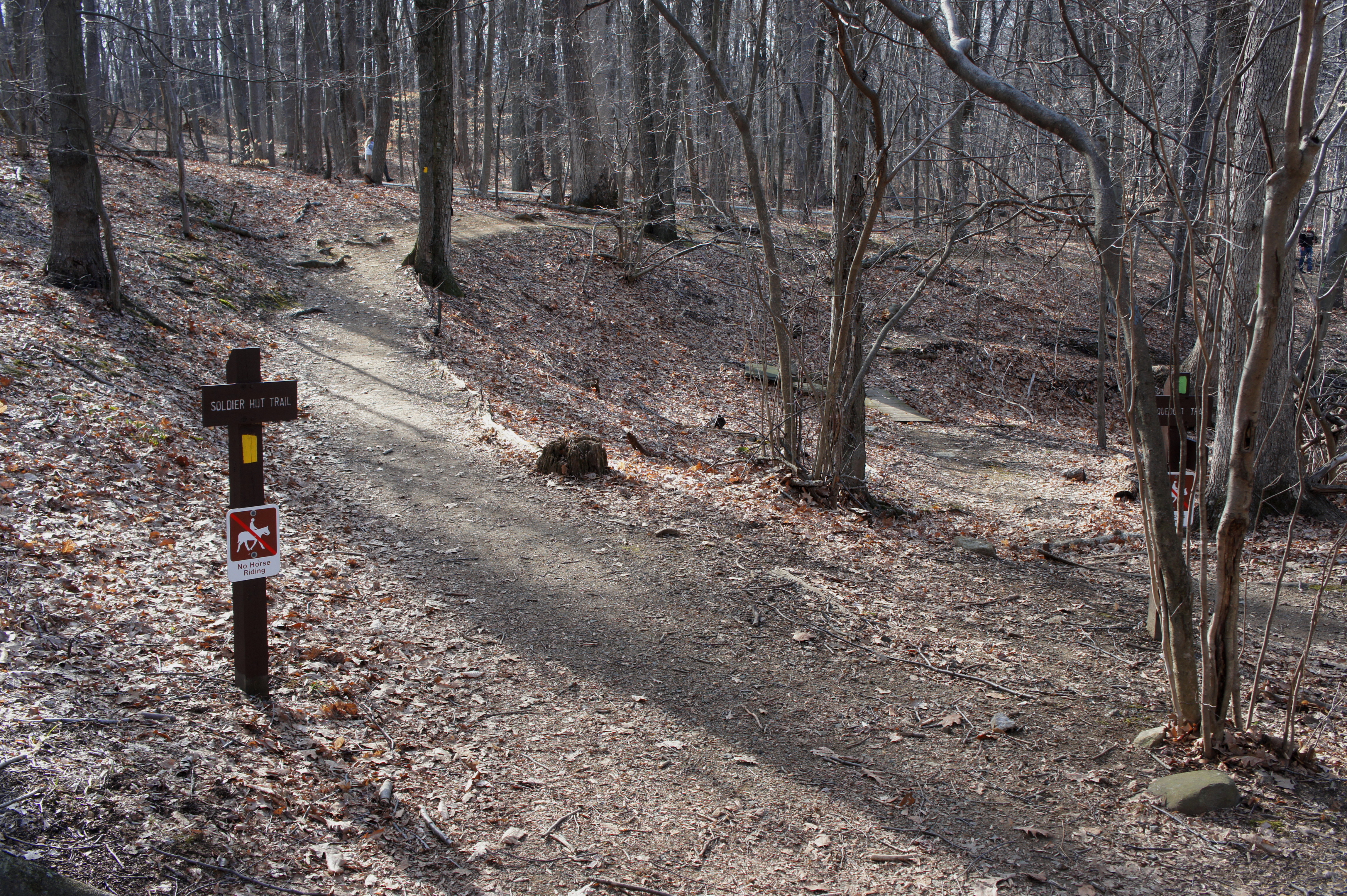 The Yellow Trail loop begins just up Cemetery Road at signpost #49 (on the right). The Soldier Hut Trail immediately dives into the woods and brush, gradually climbing to crest a low hill at 2/10 mile. By now, the trail is wide and partly graveled and descends briefly to a 5-way junction. Stay straight on the yellow-blazed path as the Green/Aqueduct Loop Trail bears off to the right. From here the Yellow Trail parallels both the road (on the left) and the Green Trail (down in the minor ravine to the right).