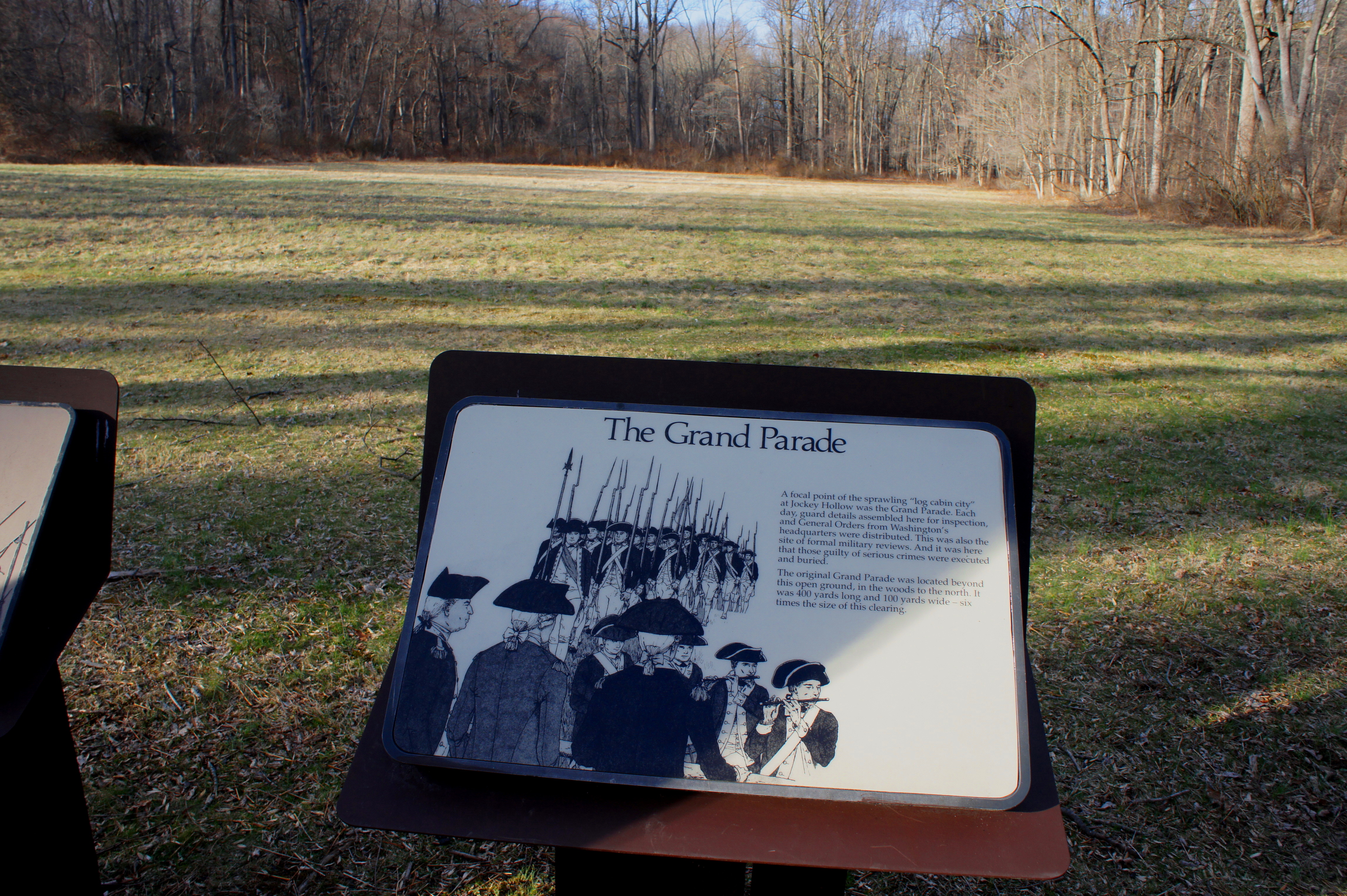 By now you are on the Grand Parade Trail, which drops sharply at roughly the 1.25-mile mark, with the sight of an open field down to your left. At 1.3 miles, the trail approaches Grand Parade Road but does not yet cross it. Stay to the left, skirting the Grand Parade, a broad field where guards reported every day for inspections and to receive orders. (Note: The original field was situated in the woods to the north and was roughly 400 yards long and 100 yards wide.)