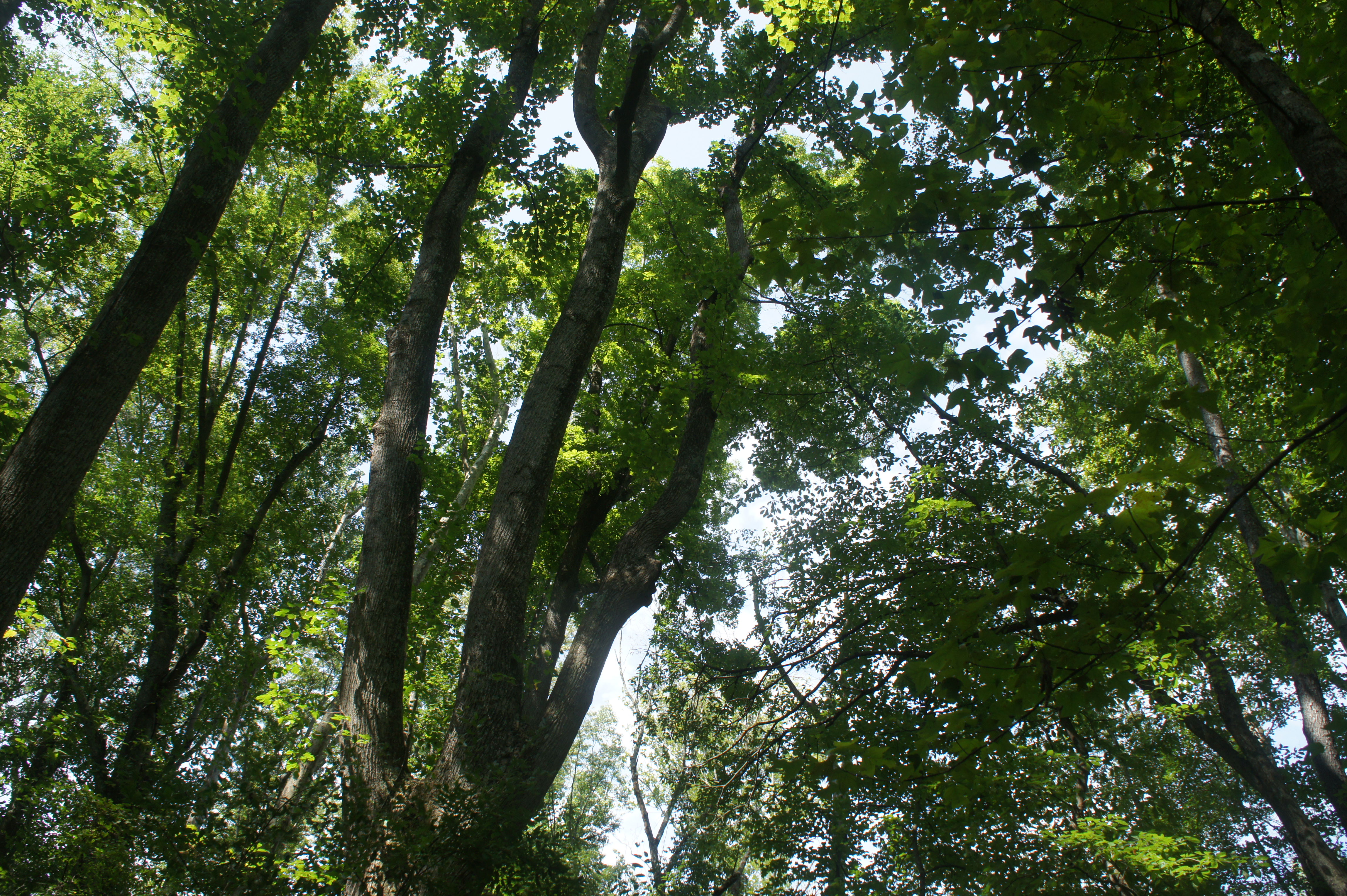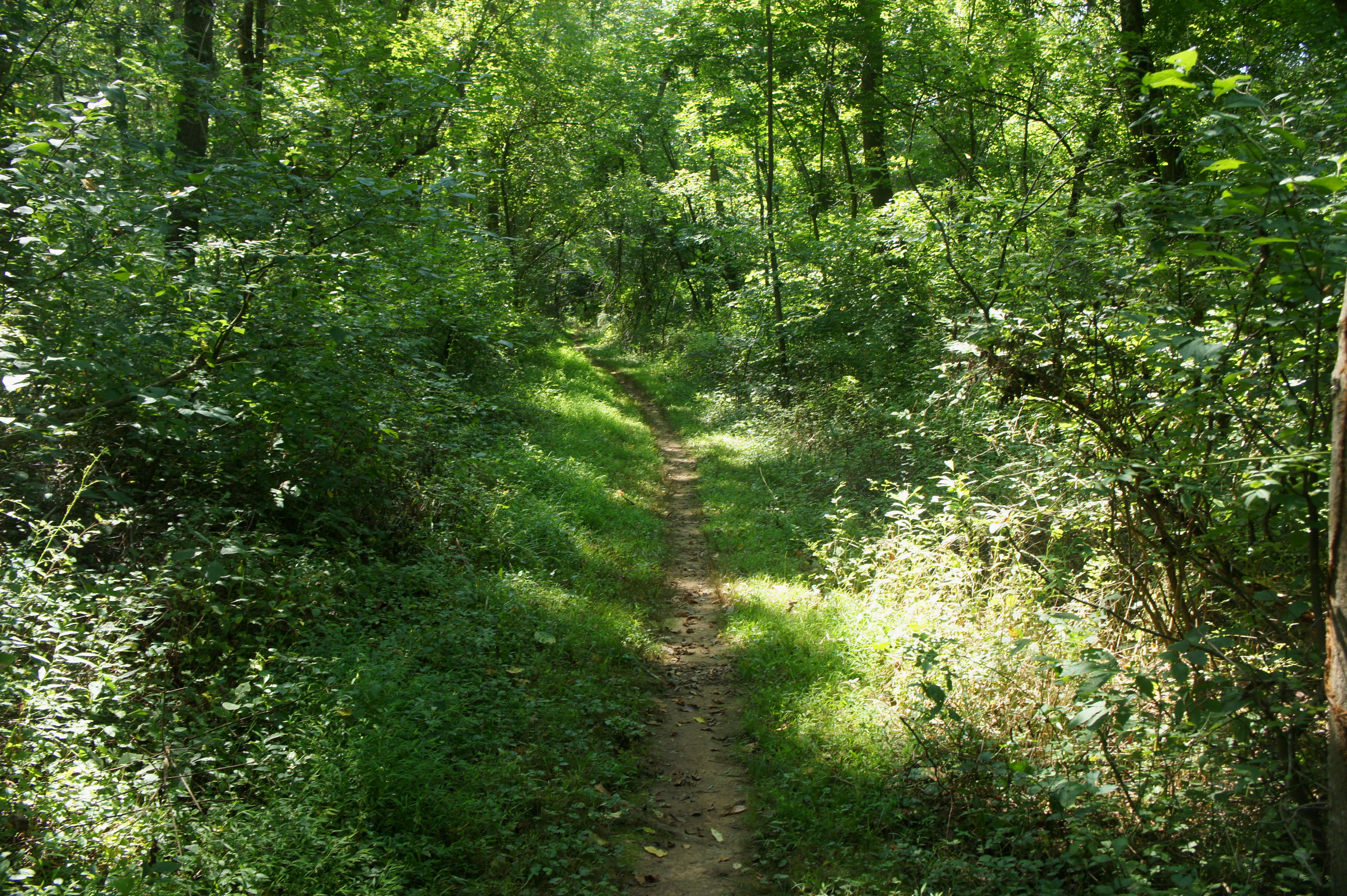 Here, the stream is quiet and peaceful, taking on a light brown hue as the sun bears down during the day. At 4/10 mile, a small gravelly beach offers an opportunity to go down to the water. At the ½-mile mark, the trail pulls away from the creek to clear a muddy tributary and then makes a short climb to the now partly-elevated floodplain. Continuing south, the path skirts an overgrown field on the left, sporadically dotted with conifers. Reentering the woods at the 1-mile mark, the trail cuts through a grove of tall and wily poplar trees, then returns to the banks of Seneca Creek. The view is fleeting, however, as the Seneca Greenway quickly dives off to the left, leaving the stream behind.