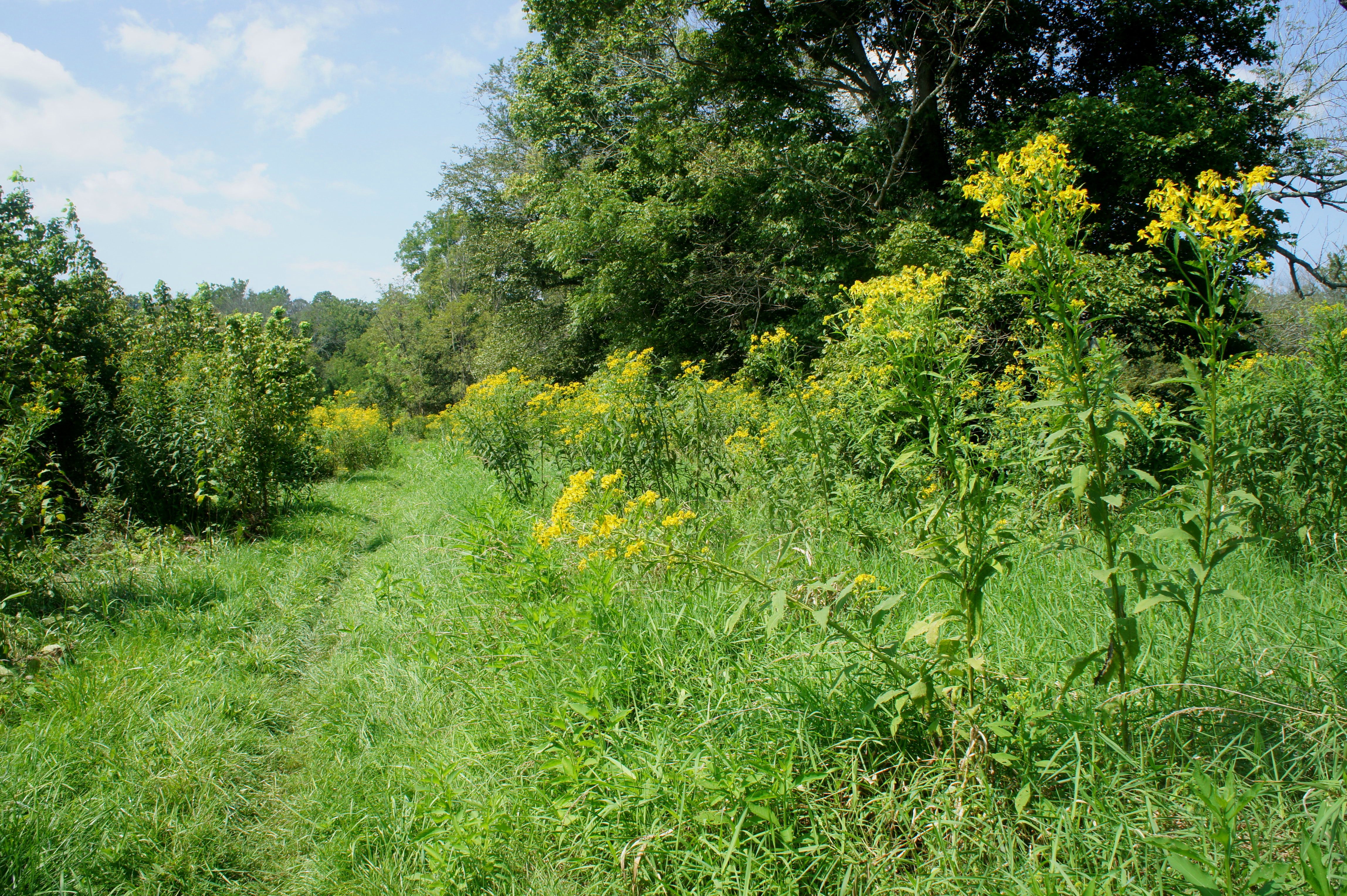 The next section is one of the hike’s most scenic, as the trail gradually descends a low ridgeline with views of Seneca Creek below on the right. At 2.5 miles, you will see what appears like a Christmas tree farm on the left—dozens and dozens of conifers, a sign of new growth on recovered farmland. A field of yellow wingstem flowers—in bloom in late summer—follows shortly thereafter.