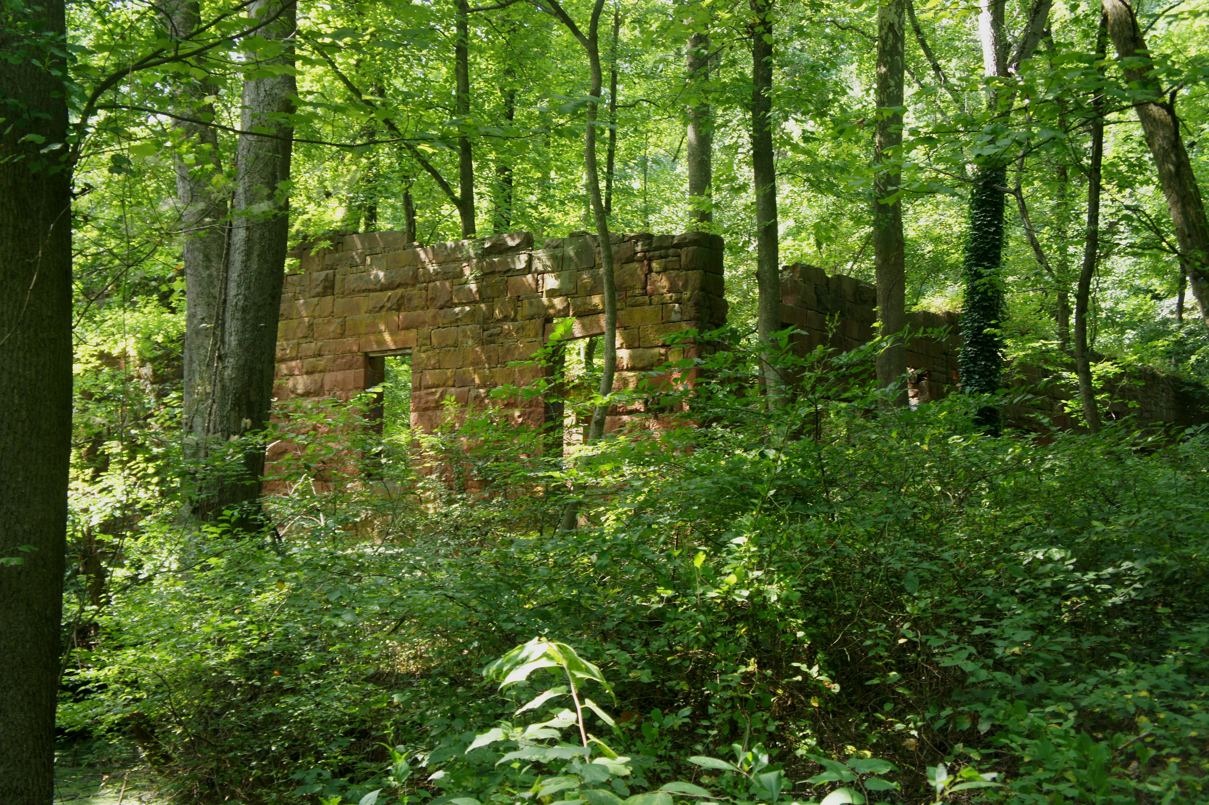 Back on the towpath, look out for an overgrown doubletrack heading off to the right, maybe a 20-30 second walk beyond the aqueduct. It’s important to find and take this turnoff—otherwise you will end up on the wrong side of a murky pond that swamps the canal just to the west. Following the pond on the left, the spur road curves north and approaches a traffic gate at 6.7 miles. Off to the left are the Seneca Stone Cutting Mill Ruins, where owners cut and shaped the rock for the aqueduct, as well as for DC’s Smithsonian Castle. (Note: While an inviting sight from afar, the ruins have been marred by extensive graffiti in recent years, ruining exploration up close.)