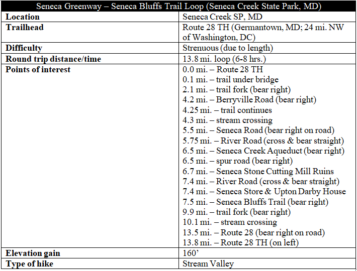 The parking area has room for around 20 cars, occupied mostly by bikers and horseback riders. Footpaths head both east and west from the trailhead; park near the far end of the parking lot and look for the large sign reading “Seneca Creek Greenway Trail; To Berryville Road 4.4 Miles.” This is the start of the hike. (Note: It is possible to do the Seneca Bluffs Trail first, but this requires backtracking and following Route 28 west for ¼ mile, across the bridge over Seneca Creek, to the trail’s start.)