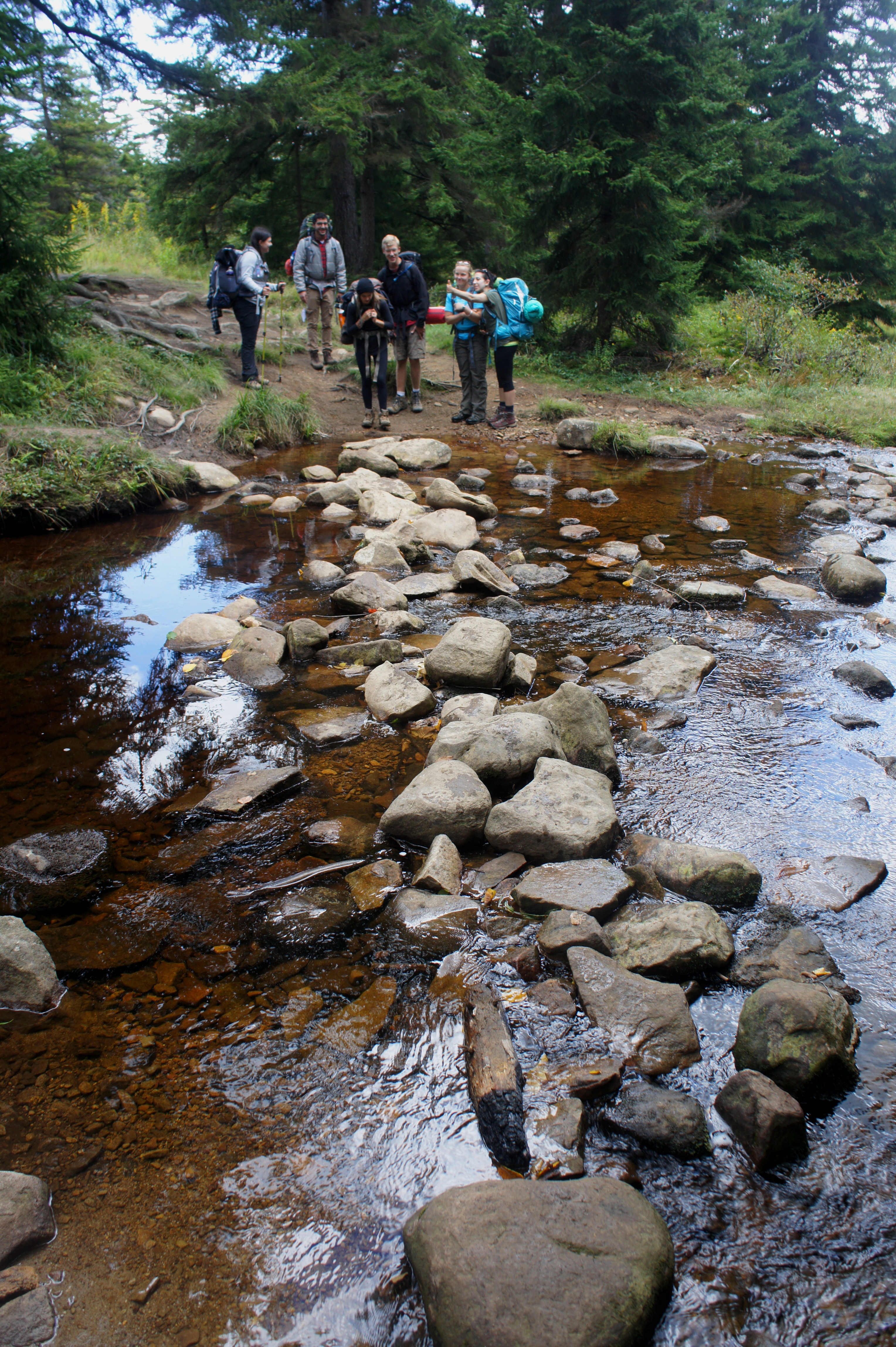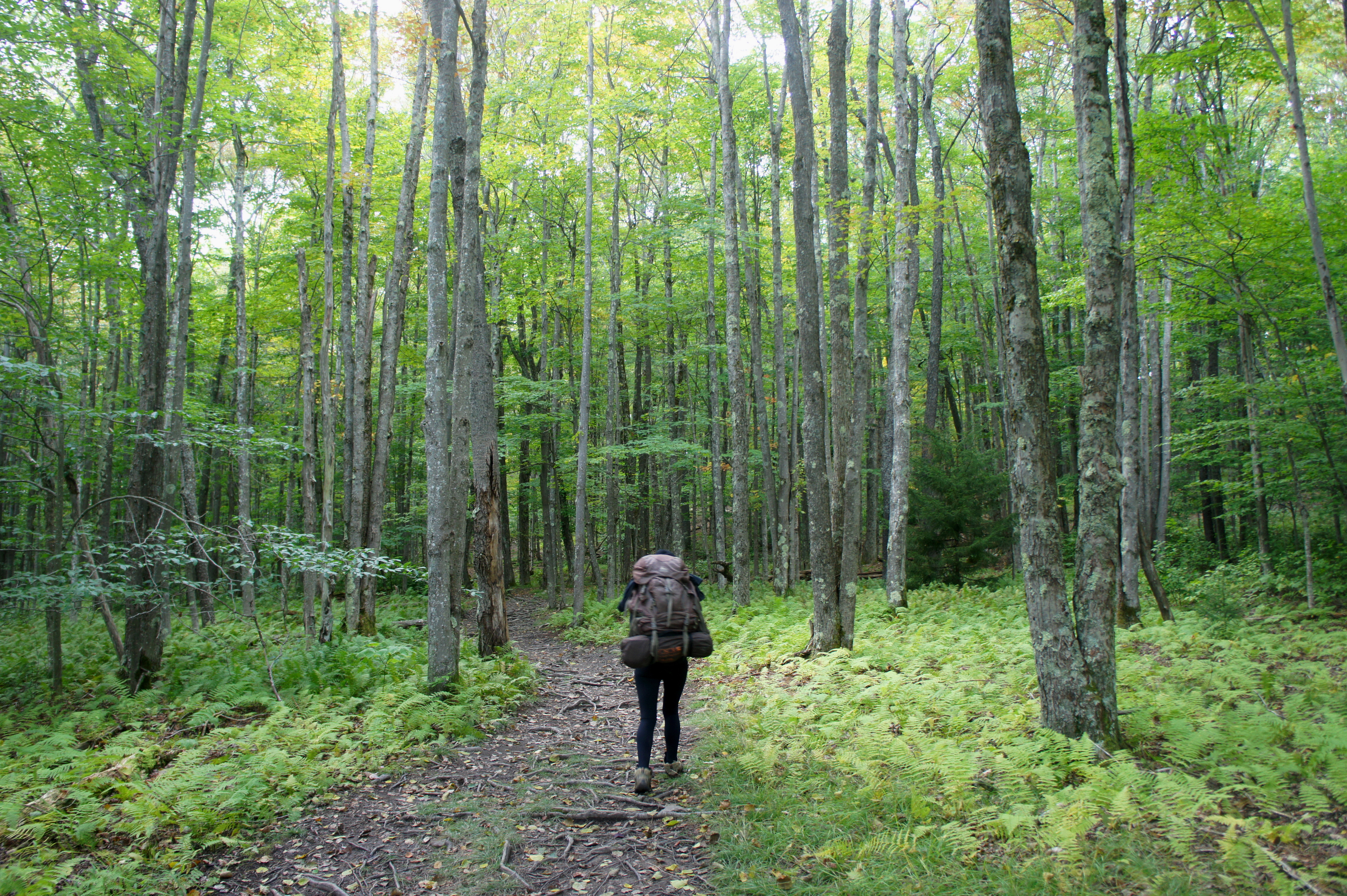 Beyond the creek, the Bear Rocks Trail climbs sharply through the woods to a minor clearing, then plunges into a northern hardwood forest dominated by red maple, yellow birch, and beech trees. The undergrowth is flush with ferns in summer. After a stretch of flat terrain, the path crosses a muddy ravine and then climbs again.