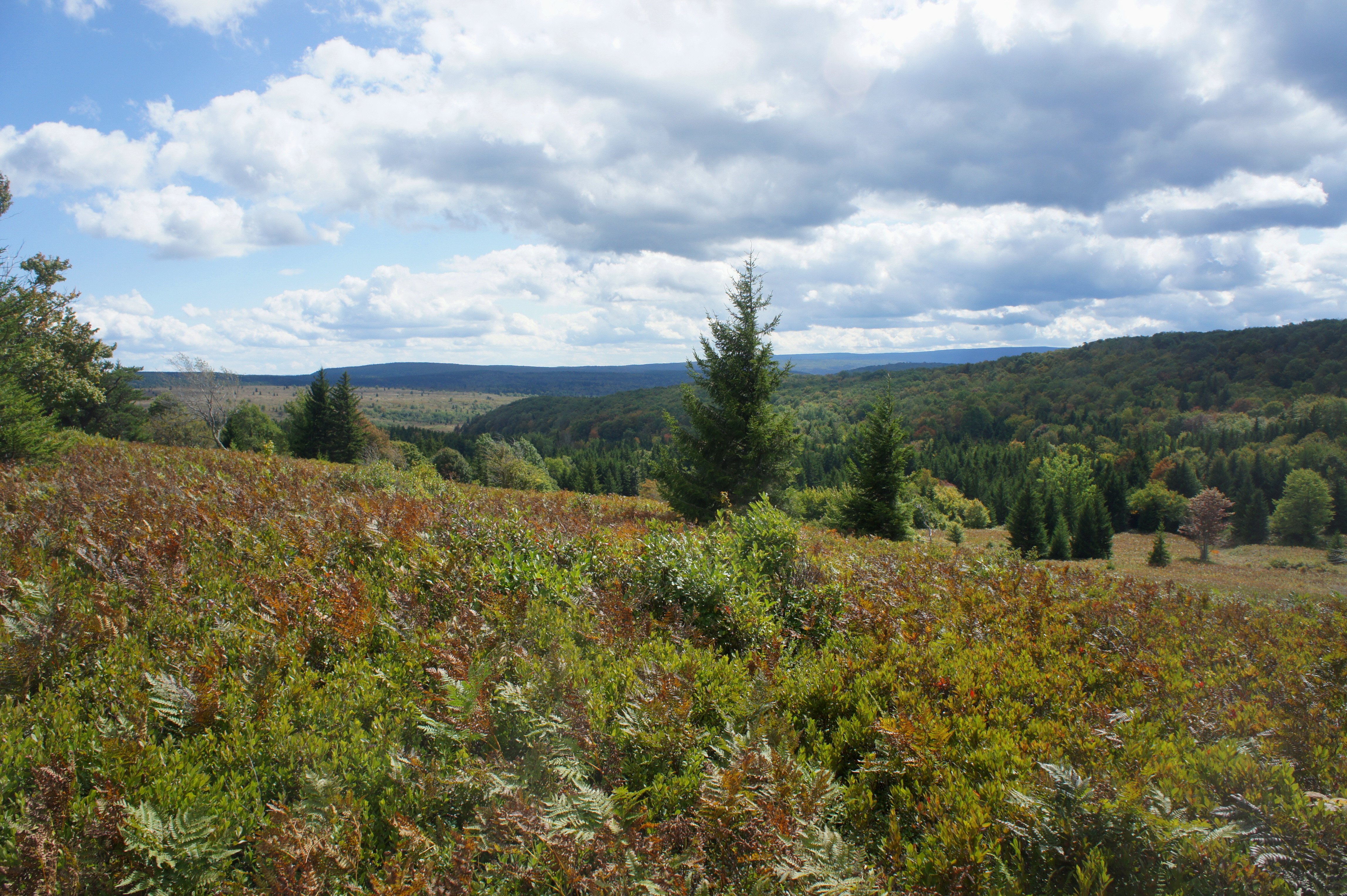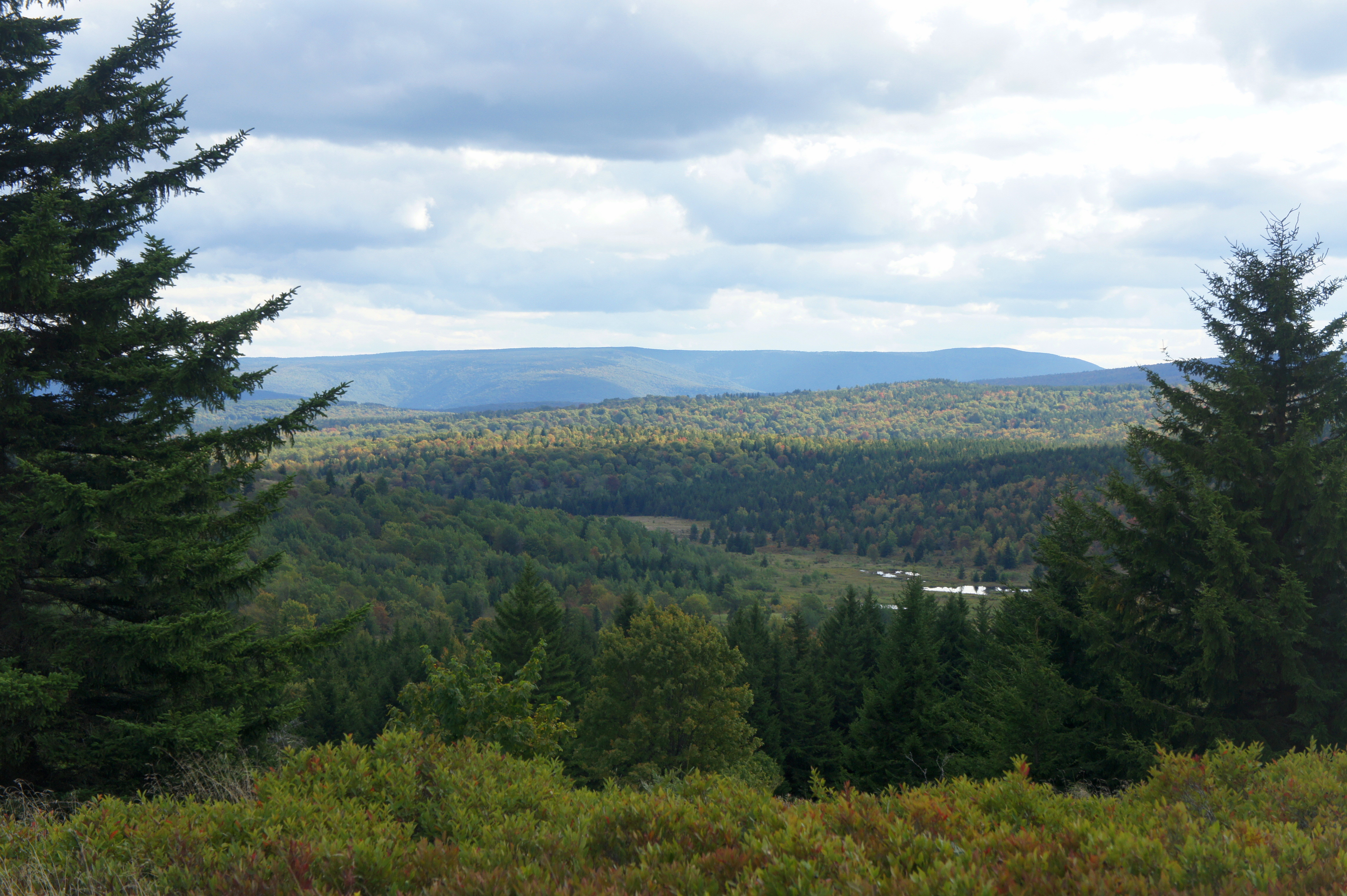 Up the slope, the trail emerges atop a grassy bald with terrific views; by now you have traveled roughly 1 ½ miles. The western slope of the hilltop leads down into an open meadow that feels like crossing the tundra in Alaska or northern Canada. In the distance to the right is a sea of spruces; to the left is a grove of deciduous trees, much more common on the east coast. The valley off to the south contains Red Creek and leads into the heart of Dolly Sods Wilderness.