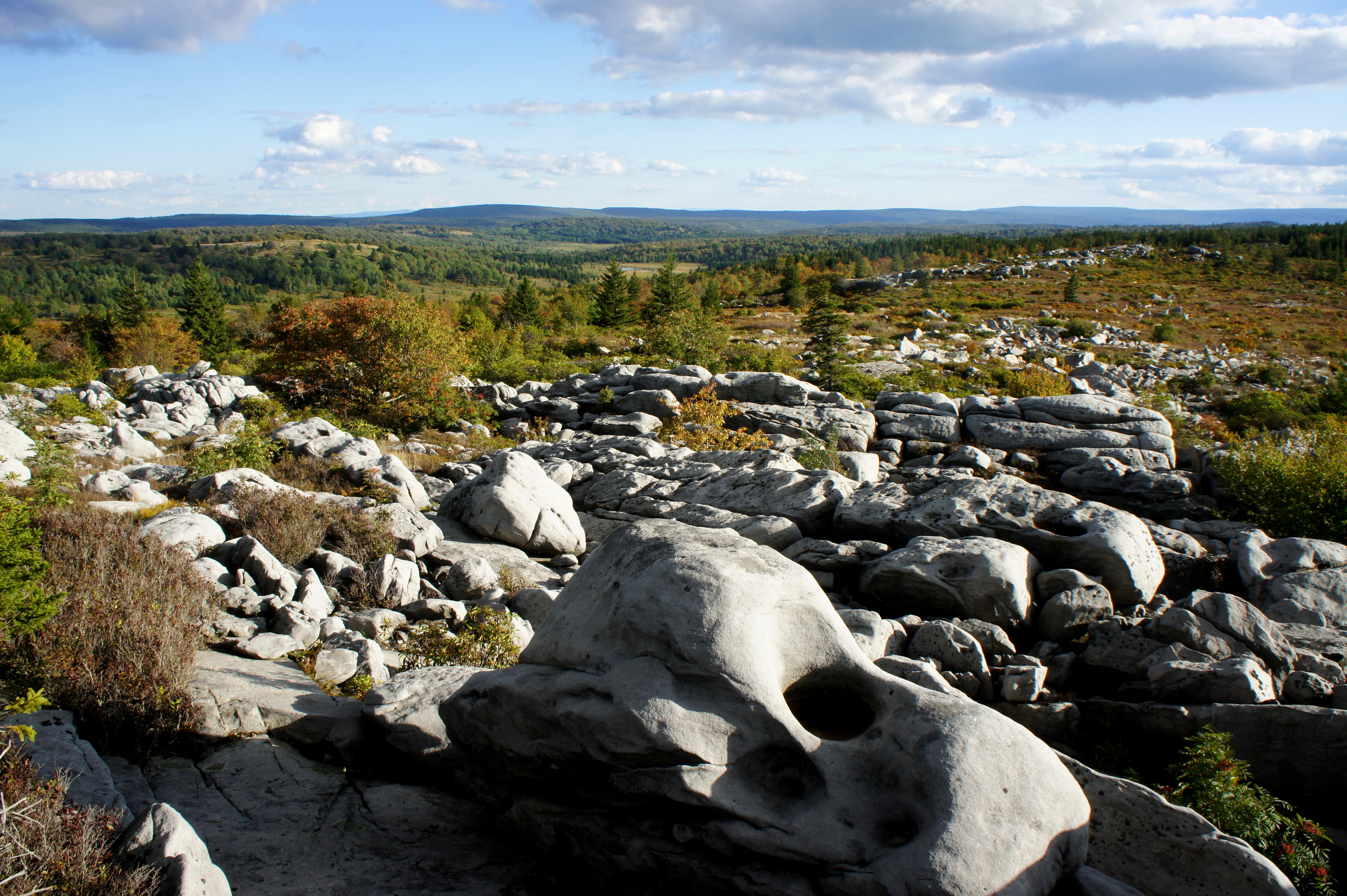 For the next mile, the trail wanders south, roughly following Rocky Ridge, and dives in and out of tree cover. At one point, the trail disappears onto the rocks themselves, requiring some route finding; the path, however, is relatively clear. A set of massive boulders with a view of Canaan Valley roughly marks the beginning of a descent to the next trail junction, which is 5.3 miles from the trailhead.