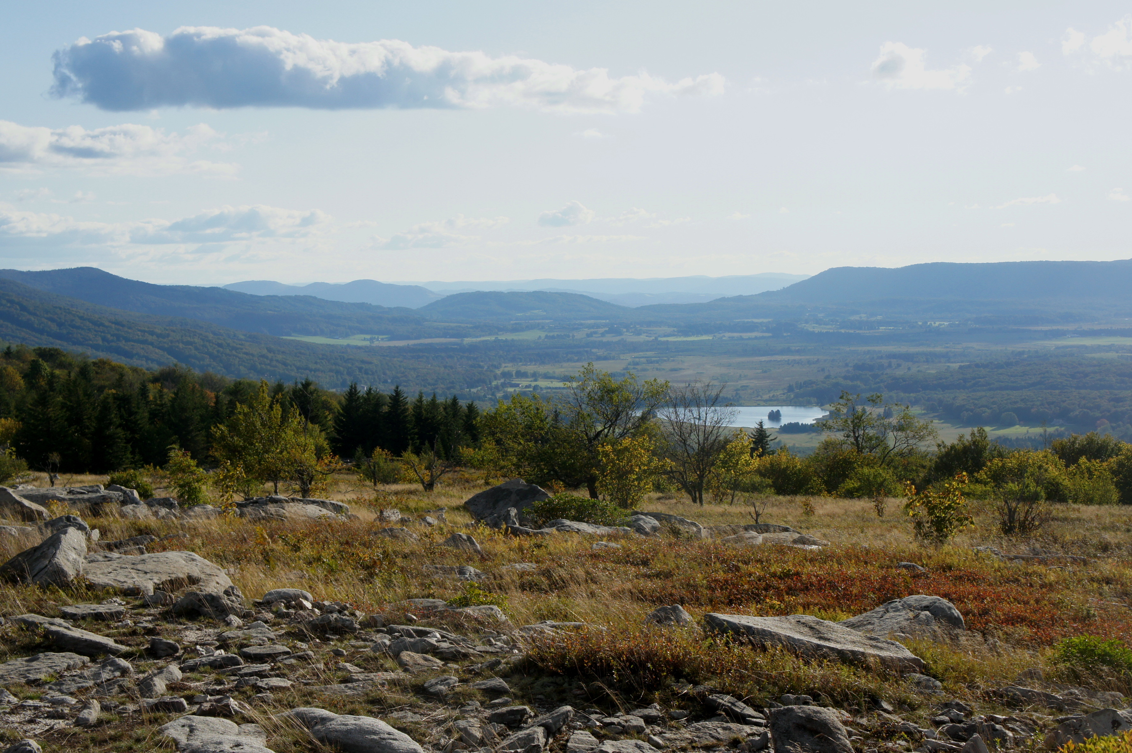After a little time in the woods, the trail spits out again into the open and approaches another trail fork. Turn left on the Rocky Ridge Trail. Partway down the trail, views open up to the west over Canaan Valley, while a rim of Pottsville sandstone to the east offers a 360-degree view of the area.