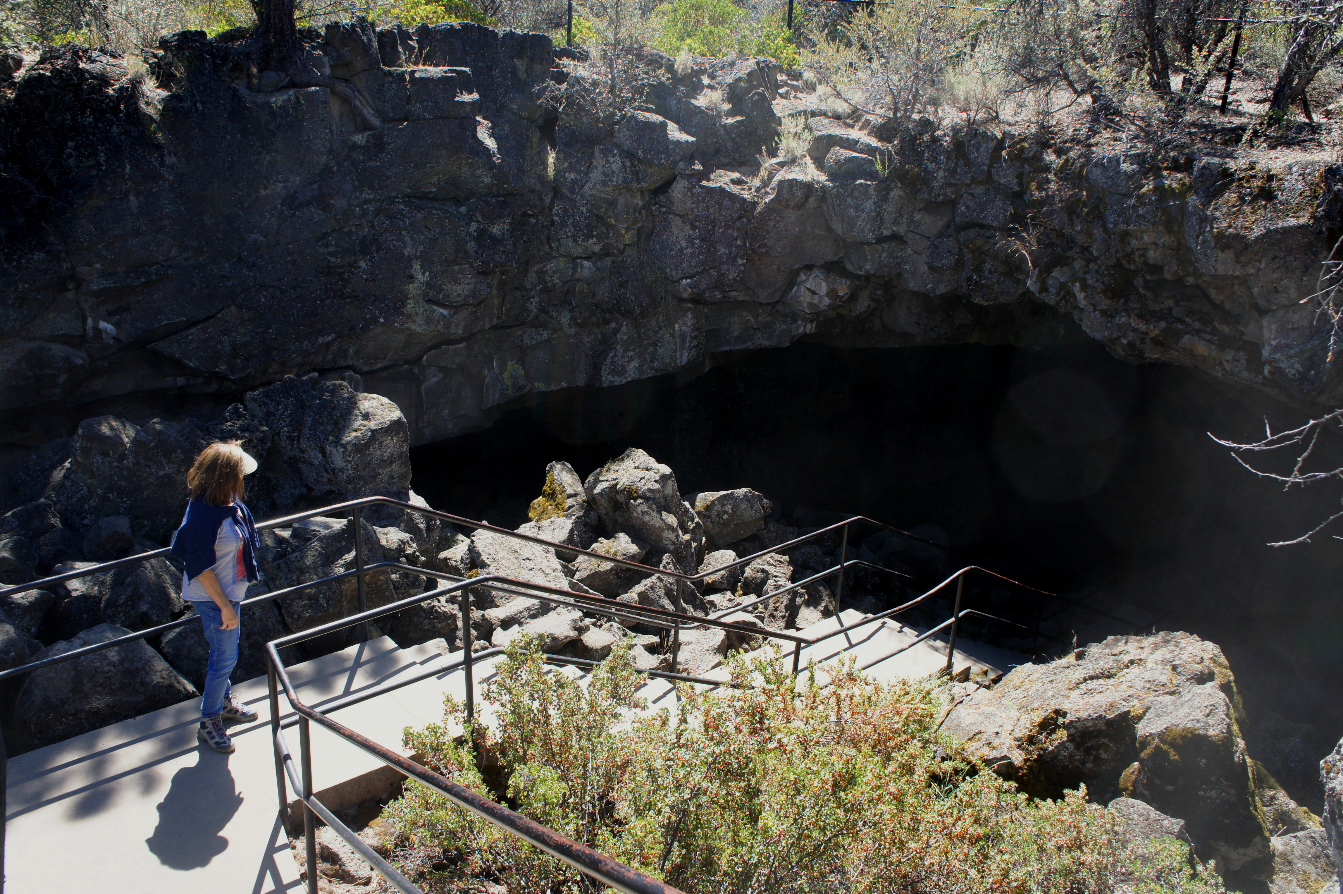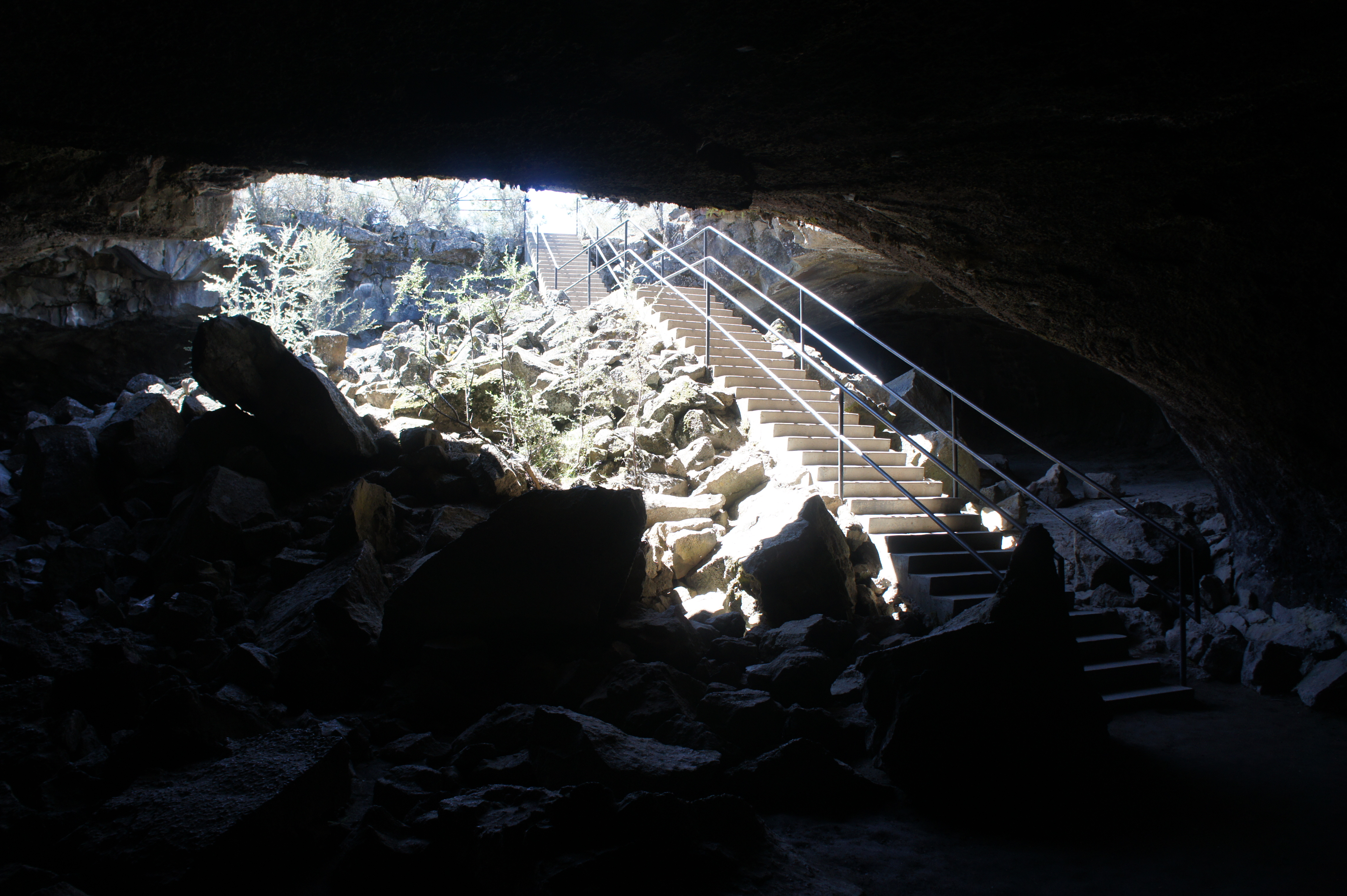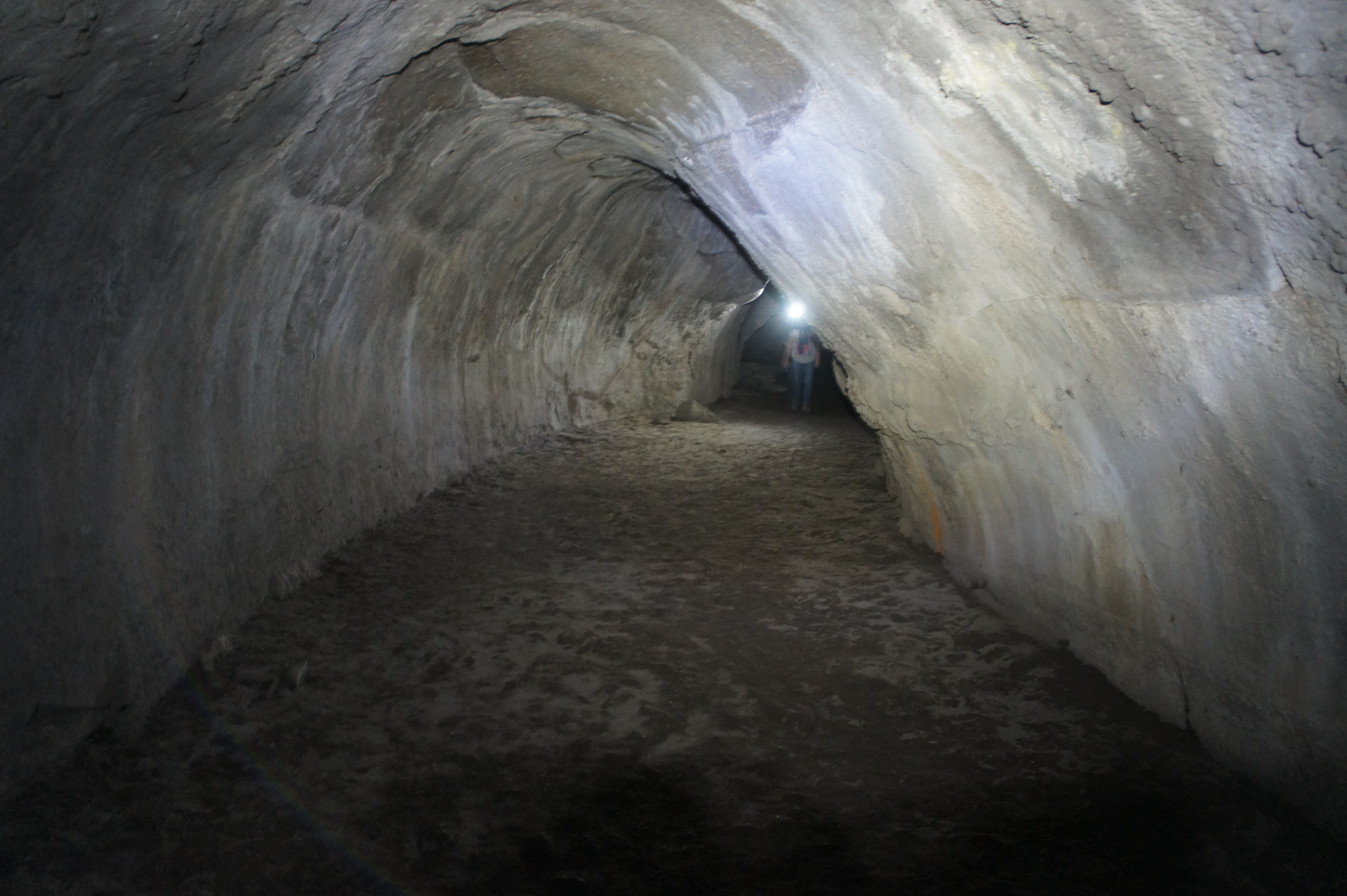 The cave entrance—as well as the exit—was the product of an ancient ceiling collapse during the tube’s cooling process. Dropping into the lave tube, large blocks of basalt—remnants of the collapsed roof—litter the landscape on the left and right. Once at the bottom of the stairs, flip on your light and head into the cool, damp cave. The passage is wide and easy to follow.