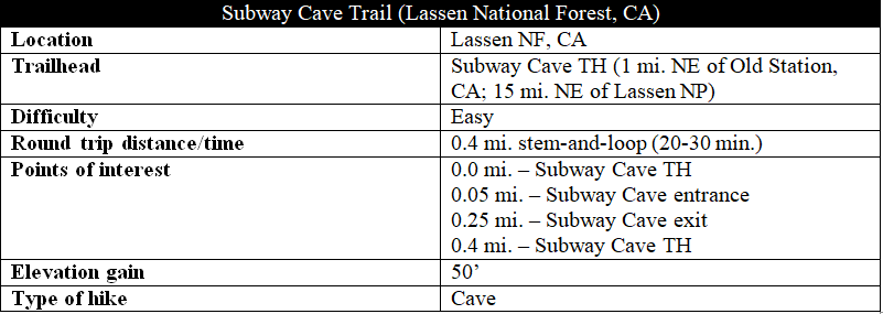 The parking area for Subway Cave is roughly one mile north of Old Station, California, along California Highway 89 (a.k.a. the Volcanic Legacy Scenic Byway). From the trailhead, the cave entrance is a short walk of less than 100 yards, though it requires scaling a set of metal stairs. At the first junction, bear left; the entrance will quickly appear on your right.