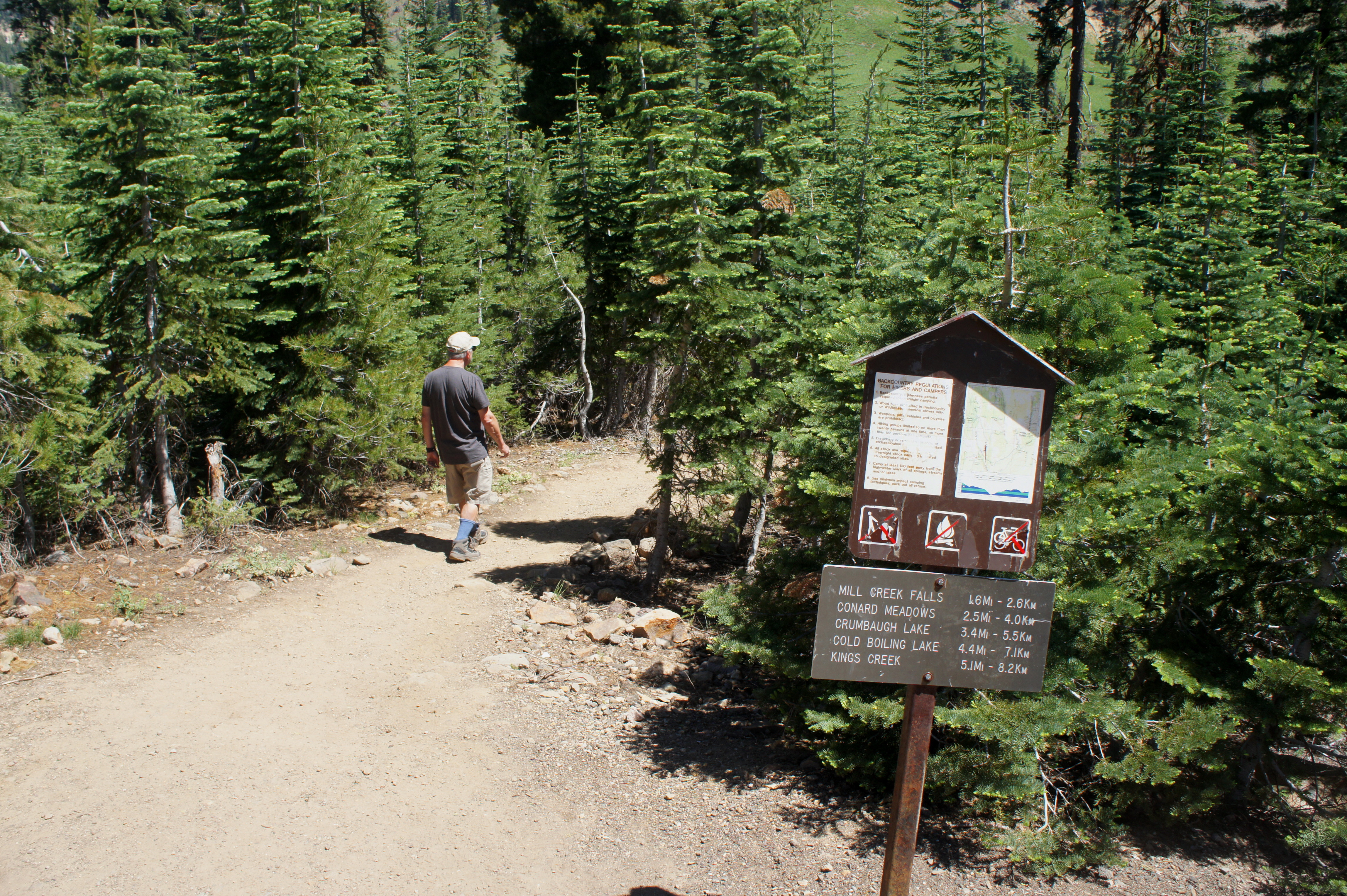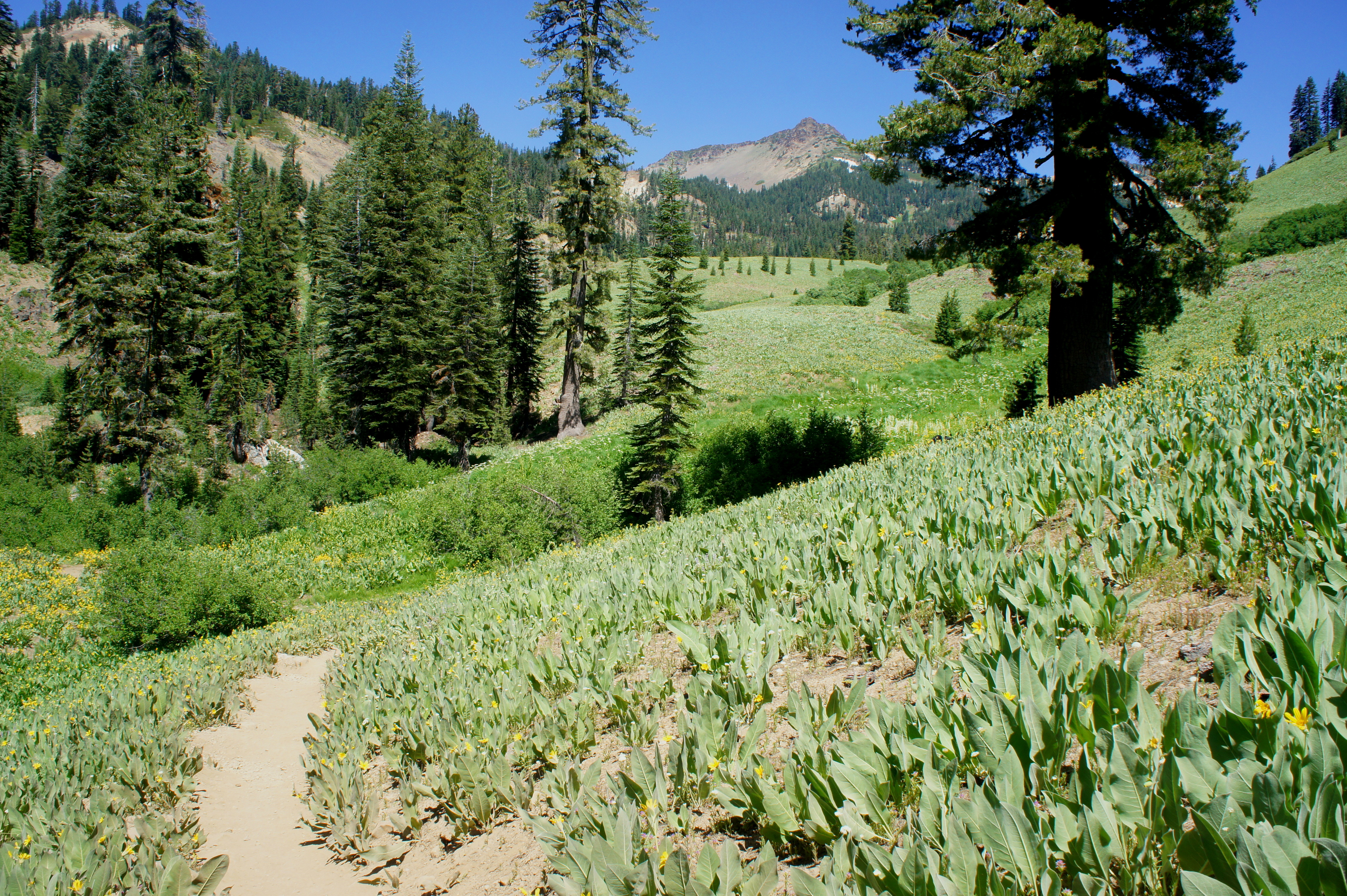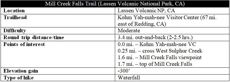 The path continues beyond, becoming the Crumbaugh Lake Trail as it meanders through Conard Meadows, eventually joins with the Bumpass Hell Trail, and ends at Kings Creek Picnic Area. Unless you are ambitious and up for some steep climbs, however, Mills Creek Falls will be your end point; turn around and return the way you came.