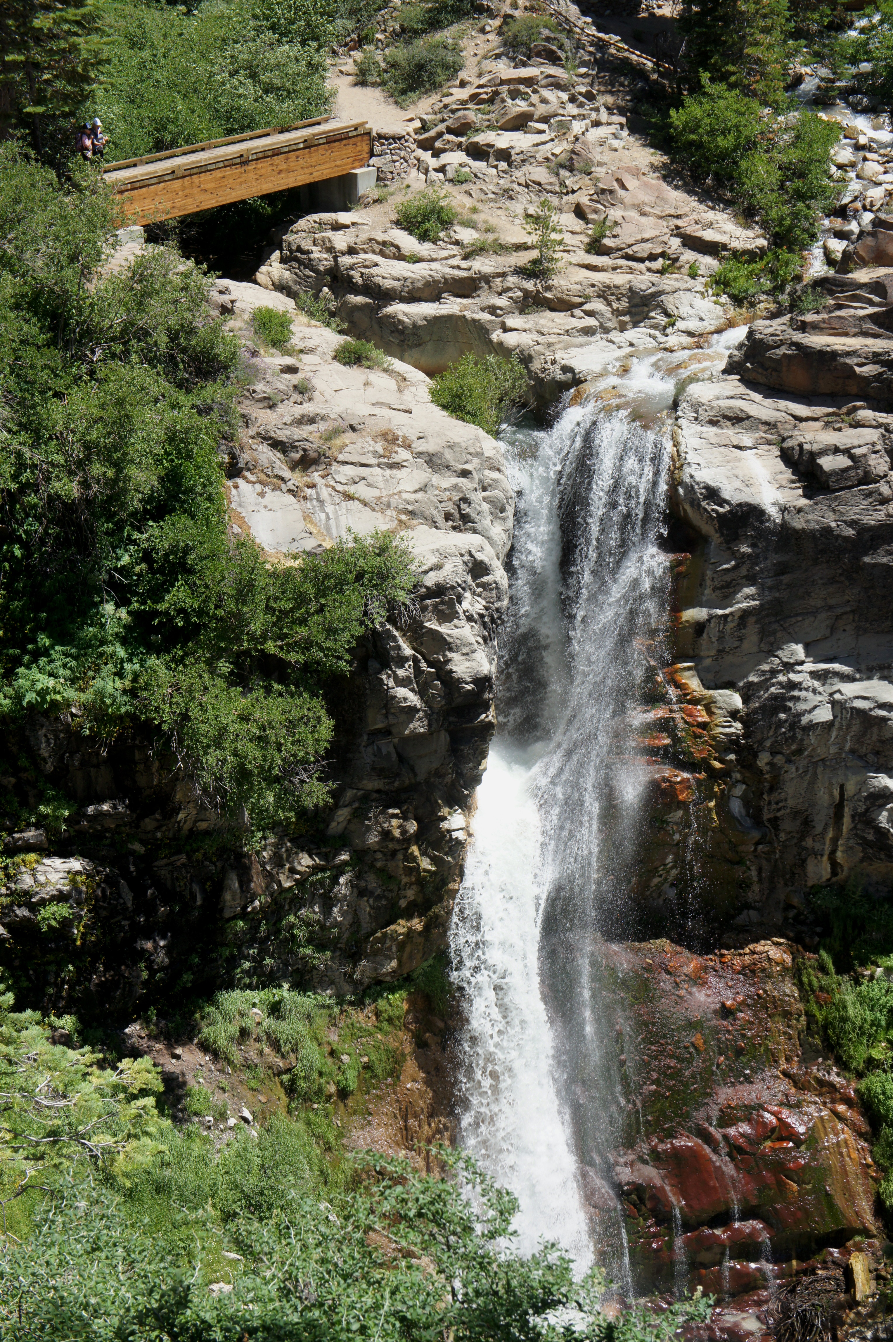 While there is no safe access to the base of the falls, the trail continues 1/10 mile past the overlook to the top of the flume. Two bridges come in quick succession—one over East Sulphur Creek, followed by a second over Bumpass Creek. From the former, you can peer down into the rock cut that gives way to the falls.